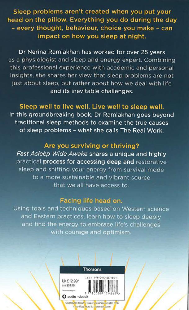 Sleep problems aren't created when you put your head on the pillow. Everything you do during the day - every thought, behaviour, choice you make - can impact on how you sleep at night.Dr. Nerina Ramlakhan has worked for over 25 years as a physiologist and sleep and energy expert. Combining this professional experience with academic and personal insights, she shares her view that sleep problems are not just about sleep, but rather about how we deal with life and its inevitable challenges.In this groundbreaking book, Dr. Ramlakhan goes beyond traditional sleep methods to examine the true causes of sleep problems - what she calls The Real Work.Fast Asleep Wide Awake shares a unique and highly practical process for accessing deep and restorative sleep and shifting your energy from survival mode to a more sustainable and vibrant source that we all have access to.Using tools and techniques based on Western science and Eastern practices, learn how to sleep deeply and find the energy to embrace life's challenges with courage and optimism.