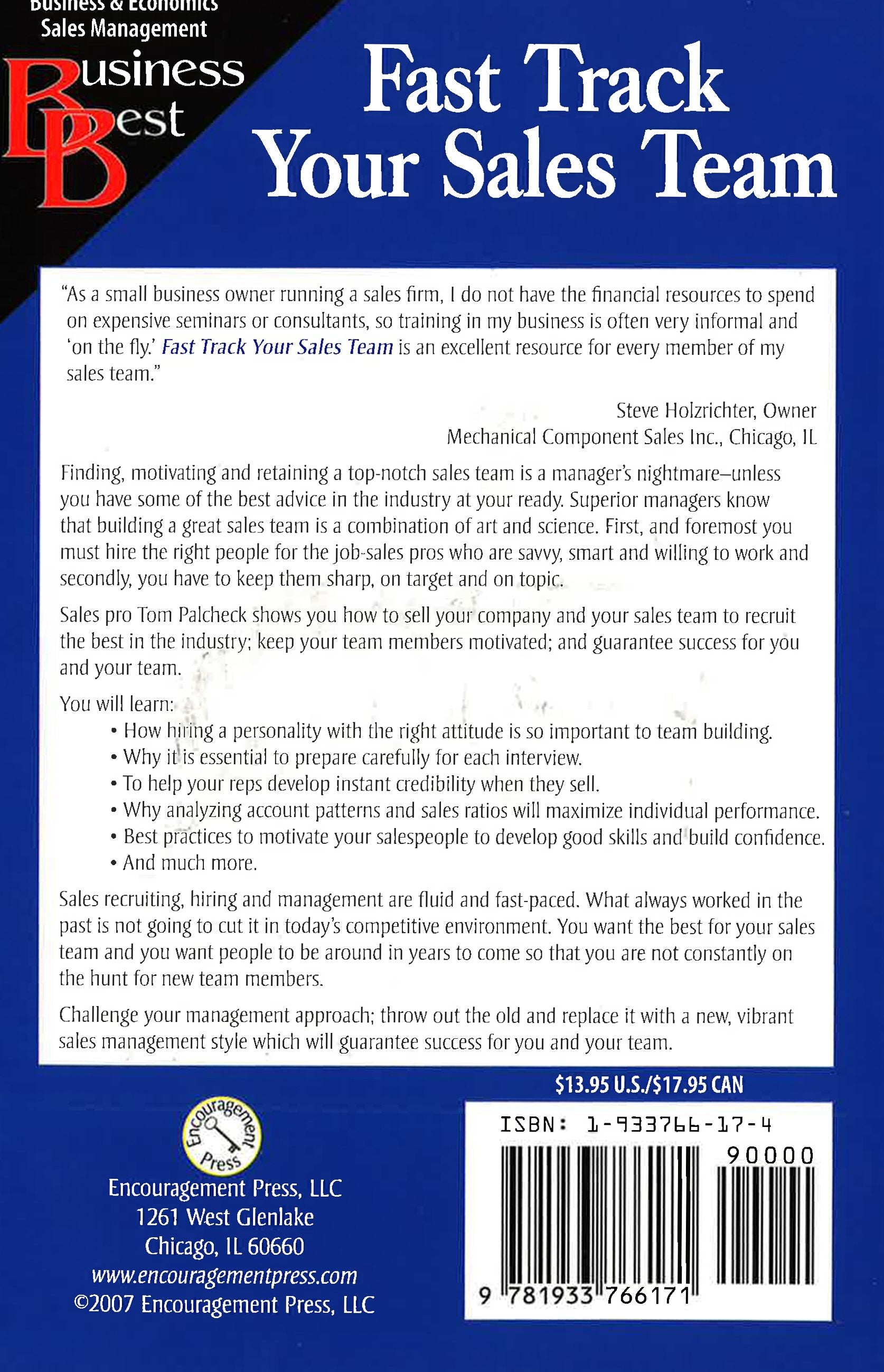In this new, highly readable and practical book, sales pro Tom Palcheck shows you how to sell your company and your sales team to recruit the best in the industry. Sales recruiting, hiring and management are fluid and fast-paced. What always worked in the past is not going to cut it in today's competitive environment. You want the best for your sales team and you want people to be around in years to come so that you are not constantly on the hunt for new team members. Learn to hire the best; find the movers and shakers in sales and keep them happy and motivated. Learn from the best, from a 20-year veteran with selling and management experience. Challenge your management approach; throw out the old and replace it with a fresh, successful and vibrant sales management style, which will guarantee success for you and for your team.