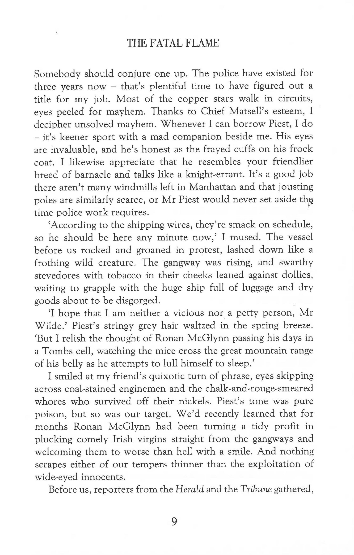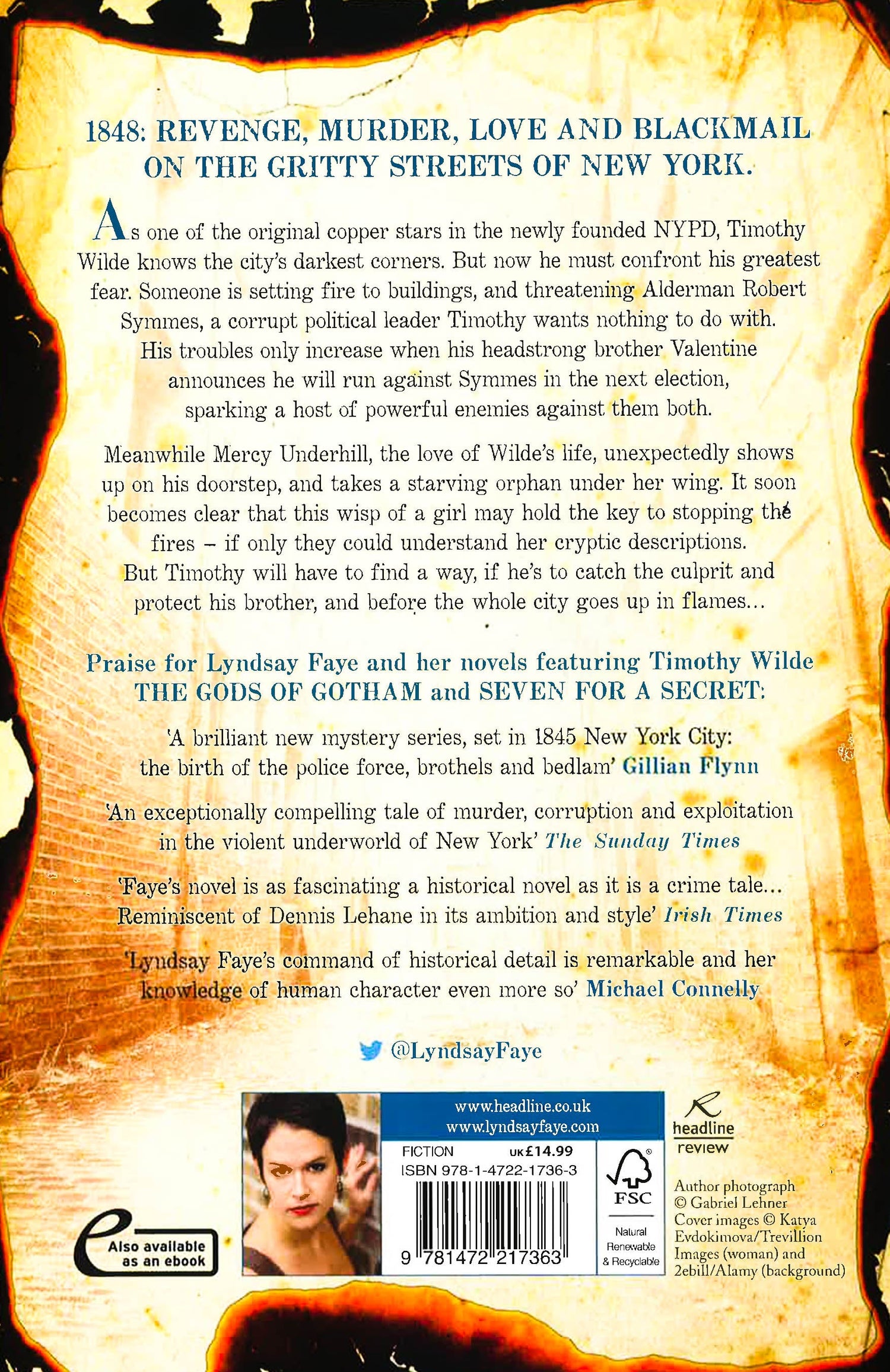 Spectacular' Gillian Flynn. THE FATAL FLAME is the stunning third novel in Lyndsay Faye's Edgar Award-nominated series, for fans of Andrew Taylor and Antonia Hodgson's The Devil in the Marshalsea. A scarred barman turned copper star, the birth of the NYPD, gangs, murder, brothels and bedlam in the dark underworld of nineteenth-century New York. Timothy Wilde - copper star, tough with a warm heart, learning his craft as a detective.Valentine Wilde - Timothy's gregarious, glamorous, depraved rogue of a brother.Mercy Underhill - The intelligent, creative but unstable love of Timothy's life.Silky Marsh - The beautiful brothel owner whose scheming knows no bounds.Against the gritty backdrop of the notorious Five Points in 1848, Timothy Wilde is drawn yet again into a disturbing mystery, leading him to the heart of the Bowery girls, the original 'factory girls' in downtown Manhattan. Someone is starting fires on the streets of New York and Timothy has to unravel a knot of revenge, murder and blackmail if he's to find out who is behind it all and stop them before the whole city goes up in flames...
