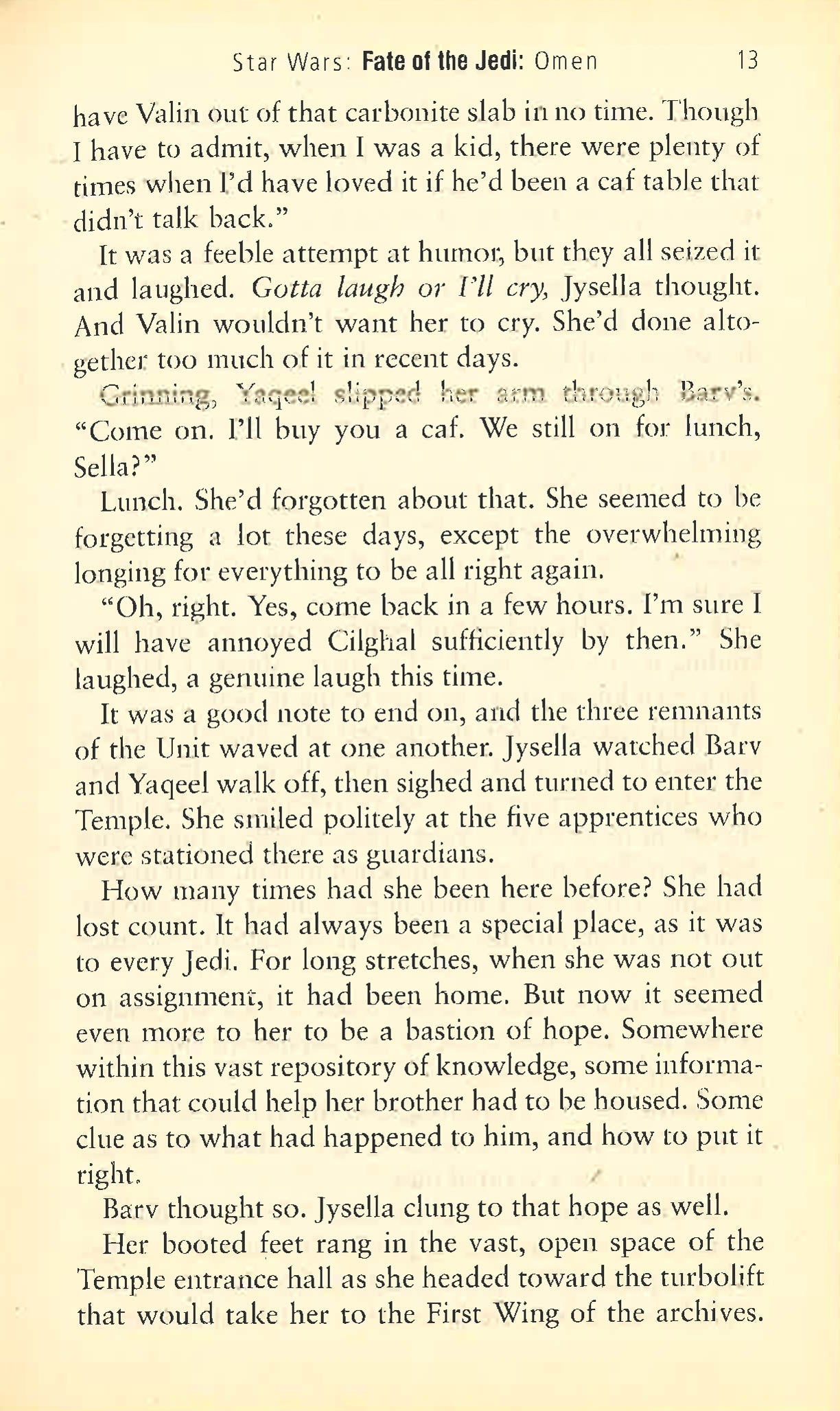 Luke and Ben Skywalker continue on their quest to learn the ways of non-Jedi Force-users and to try to understand just what went wrong with Jacen Solo that caused him to become a Sith. In the meantime, Han, Leia, and Jaina Solo -- along with Jag Fel and the other Jedi -- try to deal with the escalating problem of Jedi Knights seemingly going insane...