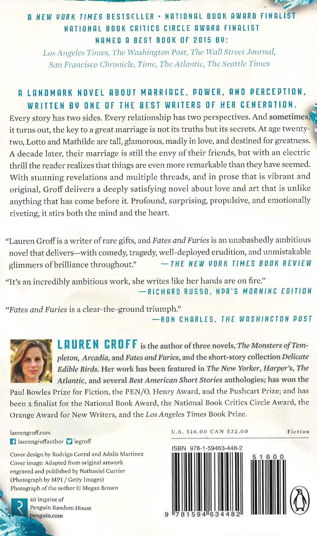 NEW YORK TIMES BESTSELLER A FINALIST FOR THE 2015 NATIONAL BOOK AWARD NPR MORNING EDITION BOOK CLUB PICK NAMED A BEST BOOK OF THE YEAR BY: THE WASHINGTON POST, NPR, TIME, THE SEATTLE TIMES, MINNEAPOLIS STAR-TRIBUNE, SLATE, LIBRARY JOURNAL, KIRKUS, AND MANY MORE "Lauren Groff is a writer of rare gifts, and Fates and Furies is an unabashedly ambitious novel that delivers - with comedy, tragedy, well-deployed erudition and unmistakable glimmers of brilliance throughout." --The New York Times Book Review (cover review) "Elaborate, sensual...a writer whose books are too exotic and unusual to be missed."--The New York Times "Fates and Furies is a clear-the-ground triumph." --Ron Charles, The Washington Post From the award-winning, New York Times-bestselling author of The Monsters of Templeton, Arcadia, and Florida, an exhilarating novel about marriage, creativity, art, and perception. Fates and Furies is a literary masterpiece that defies expectation. A dazzling examination of a marriage, it is also a portrait of creative partnership written by one of the best writers of her generation. Every story has two sides. Every relationship has two perspectives. And sometimes, it turns out, the key to a great marriage is not its truths but its secrets. At the core of this rich, expansive, layered novel, Lauren Groff presents the story of one such marriage over the course of twenty-four years. At age twenty-two, Lotto and Mathilde are tall, glamorous, madly in love, and destined for greatness. A decade later, their marriage is still the envy of their friends, but with an electric thrill we understand that things are even more complicated and remarkable than they have seemed. With stunning revelations and multiple threads, and in prose that is vibrantly alive and original, Groff delivers a deeply satisfying novel about love, art, creativity, and power that is unlike anything that has come before it. Profound, surprising, propulsive, and emotionally riveting, it stirs both the mind and the heart.