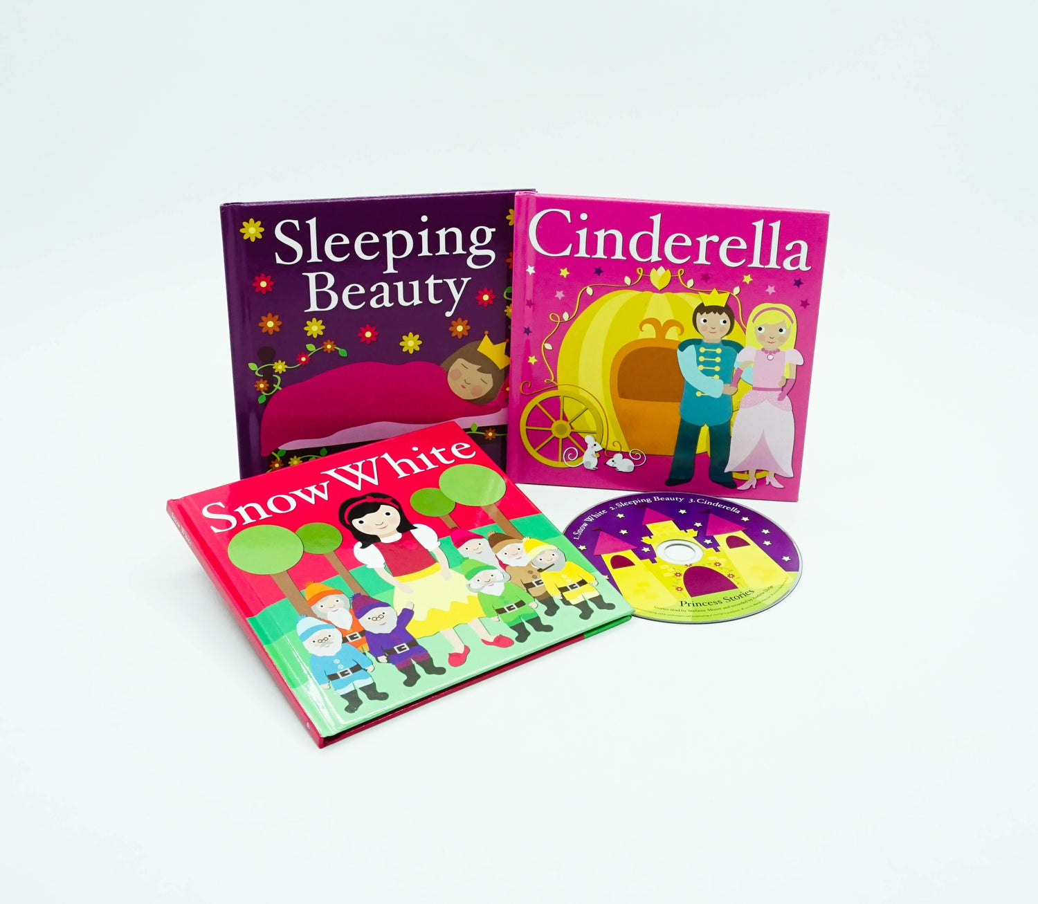 A compact collection of three illustrated books, each re-telling a classic princess story - Cinderella, Sleeping Beauty, and Snow White - with an audio CD featuring spoken versions.