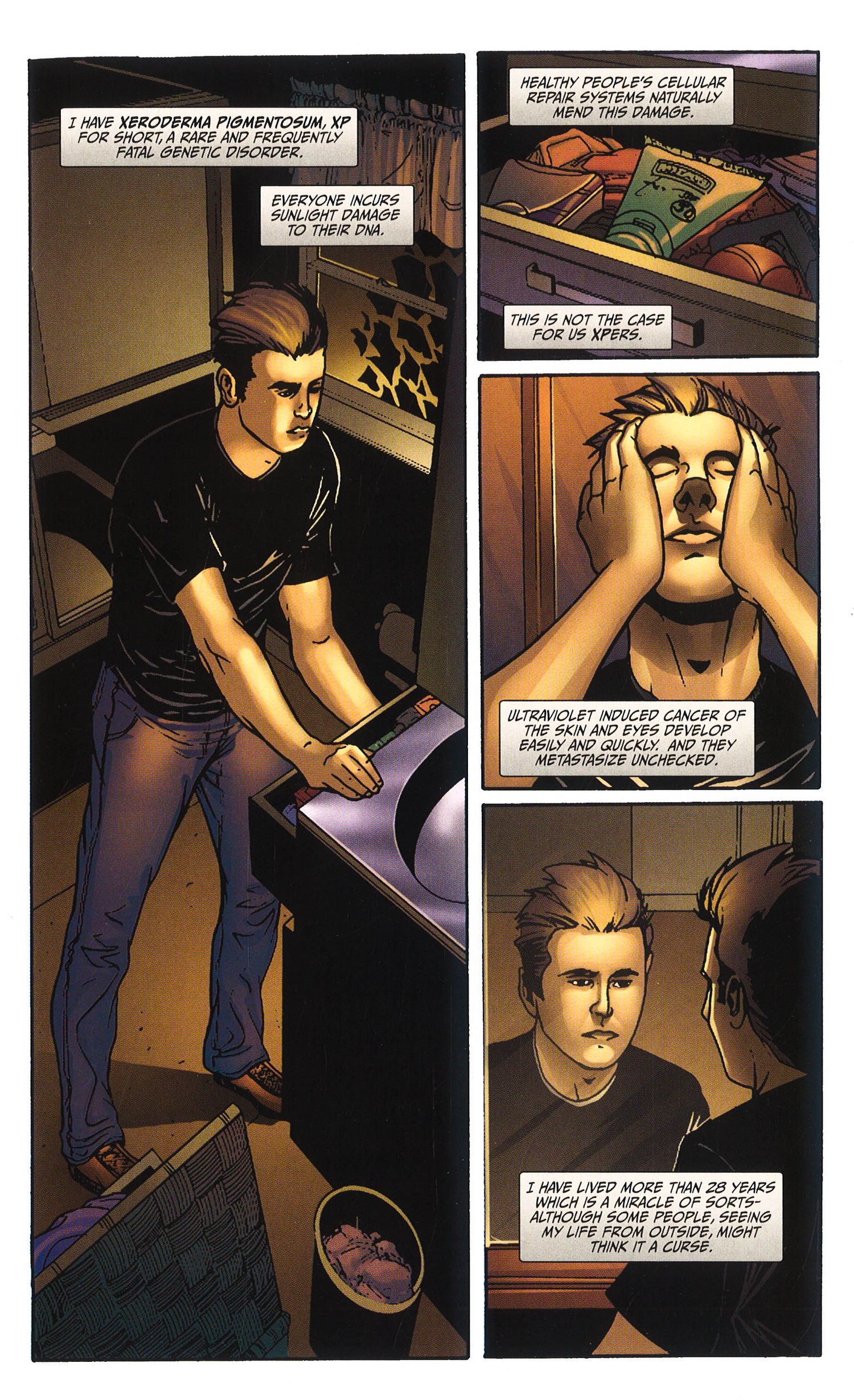 Tells the story of 28-year-old oddball hero Christopher Snow, who lives in the city of Moonlight Bay, California, along with his hyper-intelligent dog Orson, his best surfing buddy Bobby and his late-night deejay girlfriend Sasha.Fear Nothing tells the story of 28-year-old oddball hero Christopher Snow, who lives in the city of Moonlight Bay, California, along with his hyper-intelligent dog Orson, his best surfing buddy Bobby and his late-night deejay girlfriend Sasha. Snow has XP-xeroderma pigmentosum-a very rare genetic affliction that forces him to avoid light at all costs, and will likely give him cancer later in life. His parents died under mysterious circumstances and he's now being stalked by the shadowy characters who want Snow to stop trying to find out how they died--or else they'll bump off his remaining loved ones.