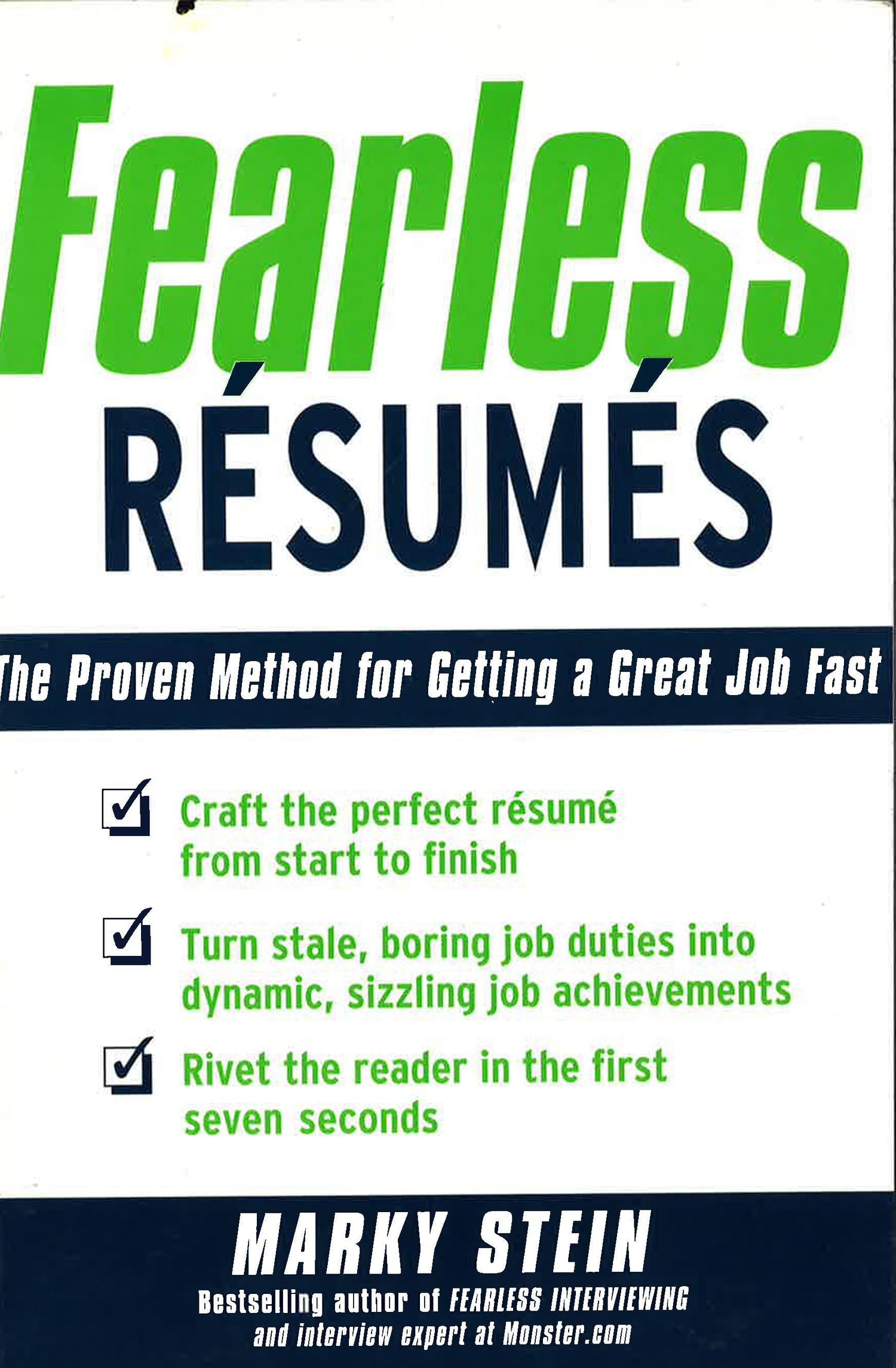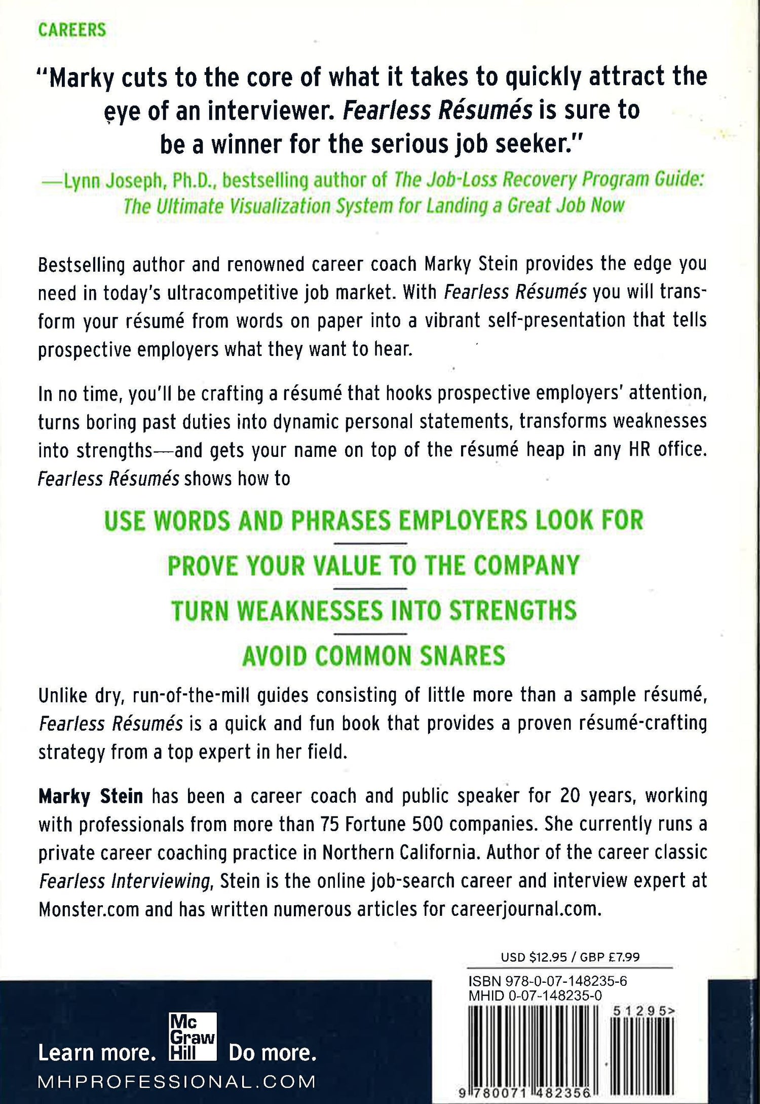 Bestselling author and renowned career coach Marky Stein provides the edge youneed in today's ultracompetitive job market. With Fearless Resumes you will transformyour resume from words on paper into a vibrant self-presentation that tellsprospective employers what they want to hear. In no time, you'll be crafting a resume that hooks prospective employers' attention,turns boring past duties into dynamic personal statements, transforms weaknessesinto strengths-andgets your name on top of the resume heap in any HR office. Fearless Resumes shows how to. Use words and phrases employers look forProve your value to the companyTurn weaknesses into strengthsAvoid common snares. Unlike dry, run-of-the-mill guides consisting of little more than a sample resume,Fearless Resumes is a quick and fun book that provides a proven resume-craftingstrategy from a top expert in her field.