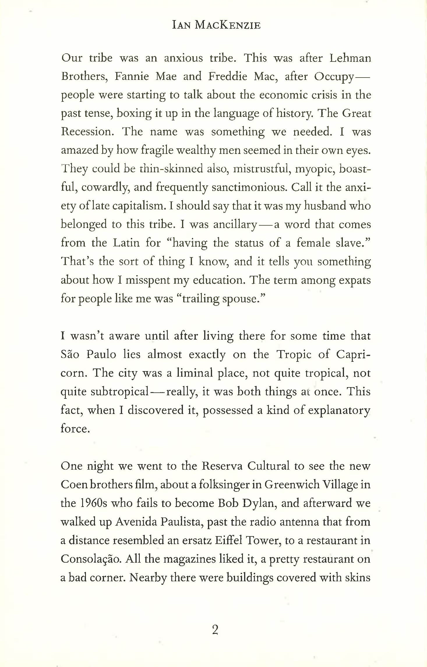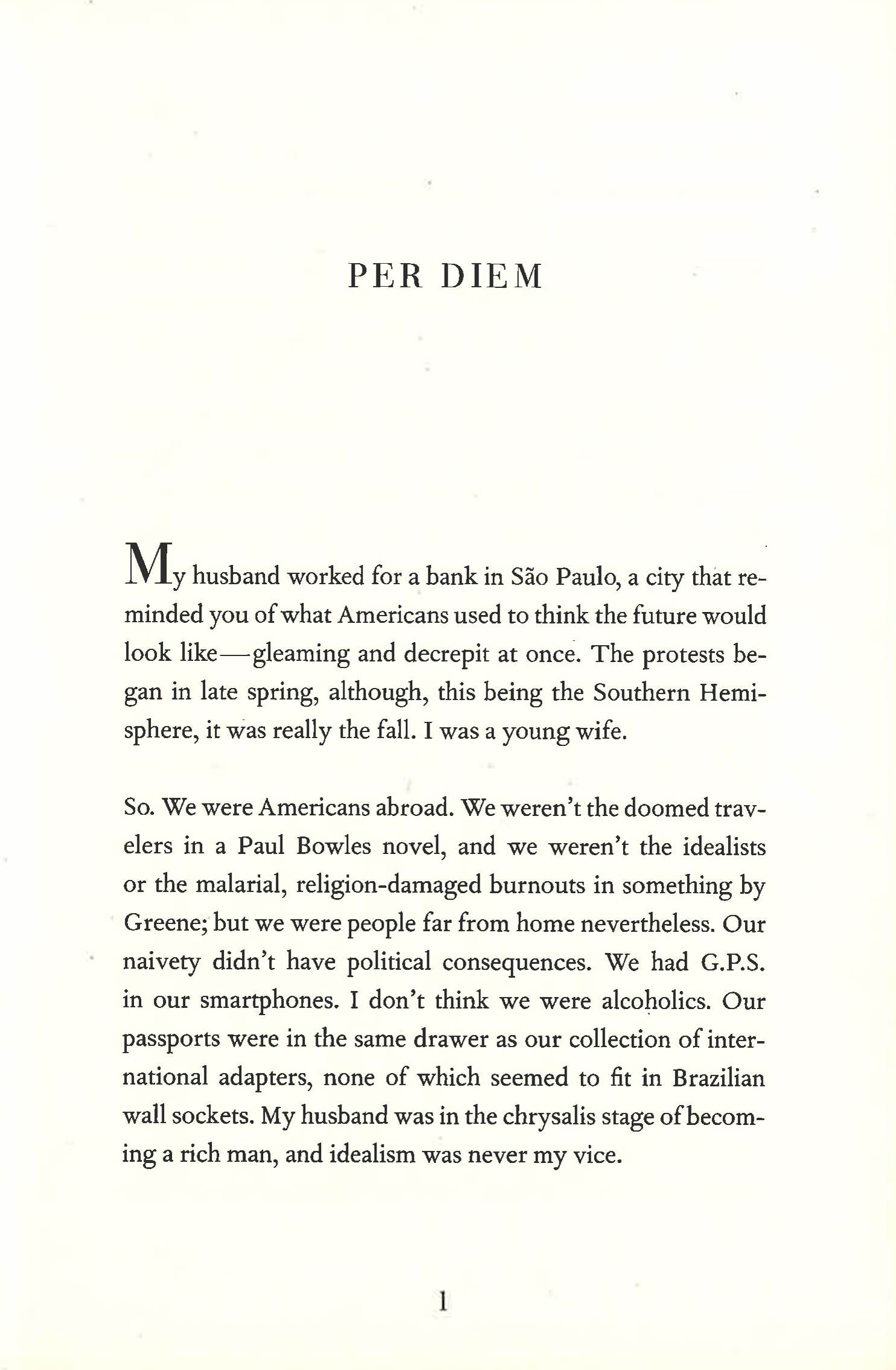 Brilliant. Among the best novels I know about the fate of American innocence abroad' Garth Greenwell So. We were Americans abroad. We weren't the doomed travellers in a Paul Bowles novel, and we weren't the idealists or the malarial, religion-damaged burnouts in something by Greene; but we were people far from home nevertheless. Our naivety didn't have political consequences. We had G.P.S. in our smartphones. I don't think we were alcoholics. Our passports were in the same drawer as our collection of international adapters, none of which seemed to fit in Brazilian wall sockets. My husband was in the chrysalis stage of becoming a rich man, and idealism was never my vice. I was ancillary - a word that comes from the Latin for 'having the status of a female slave'. That's the sort of thing I know, and it tells you something about how I misspent my education. The term among expats for people like me was 'trailing spouse' . . . 'Captivating' Irish Times 'Devastating, funny and wise' Garth Greenwell 'A triumph' Samantha Harvey 'A writer so gifted with language that you forget who you are in the poetry of his prose' Uzodinma Iweala 'Magnificent, profound, and true' Elisa Albert 'Reminded me in parts of Maggie Nelson. Stunning' Sophie Mackintosh