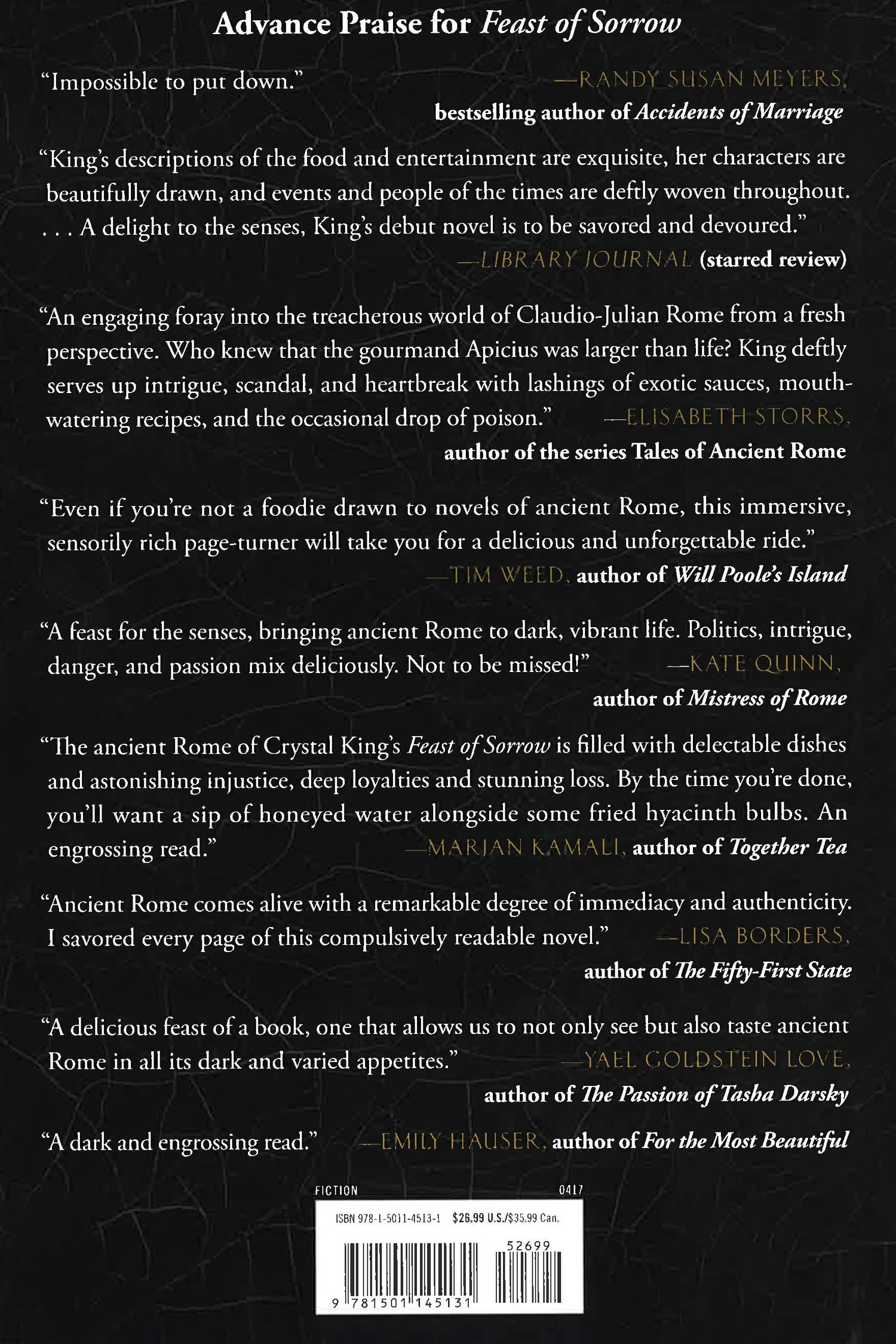 Set amongst the scandal, wealth, and upstairs-downstairs politics of a Roman family, Crystal King’s seminal debut features the man who inspired the world’s oldest cookbook and the ambition that led to his destruction.On a blistering day in the twenty-sixth year of Augustus Caesar’s reign, a young chef, Thrasius, is acquired for the exorbitant price of twenty thousand denarii. His purchaser is the infamous gourmet Marcus Gavius Apicius, wealthy beyond measure, obsessed with a taste for fine meals from exotic places, and a singular ambition: to serve as culinary advisor to Caesar, an honor that will cement his legacy as Rome's leading epicure.Apicius rightfully believes that Thrasius is the key to his culinary success, and with Thrasius’s help he soon becomes known for his lavish parties and fantastic meals. Thrasius finds a family in Apicius’s household, his daughter Apicata, his wife Aelia, and her handmaiden, Passia, with whom Thrasius quickly falls in love. But as Apicius draws closer to his ultimate goal, his reckless disregard for any who might get in his way takes a dangerous turn that threatens his young family and places his entire household at the mercy of the most powerful forces in Rome.