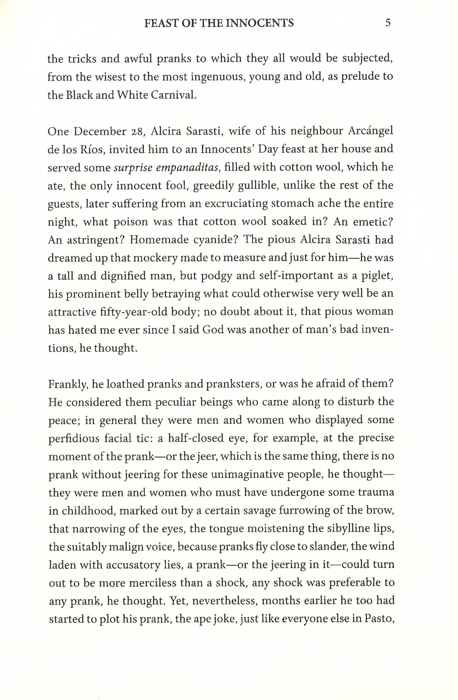 Doctor Justo Pastor Proceso Lopez should be a happy man--he has a family, a thriving medical practice, and adoring patients--but he lives a troubled life. He is married to a beautiful woman, but she despises him, and thanks to her influence he is unable to win favor with his two daughters. In his growing despair, Lopez becomes obsessed with exposing the myth of national hero Simon Bolivar--El Libertador, "The Liberator"--for what it truly is: a lie covering up years of massacres, betrayals, and sex scandals. But in interviewing elder locals about their memories of Bolivar he discovers that in Pasto, Colombia, the myth of Bolivar holds a tight grip on the identity of the city. To put an end the cult of El Libertador, Lopez devises an elaborate stunt involving a carnival float on the day of The Black and White Carnival, celebrating the Feast of the Holy Innocents. In the feverish atmosphere of the Feast celebrations, Doctor Lopez watches his life come undone before his eyes. From one of Colombia's foremost literary talents, Feast of the Innocents is both heartbreaking and triumphant, a literary portrait of obsession, alienation, and cultural identity in 1960s Colombia.