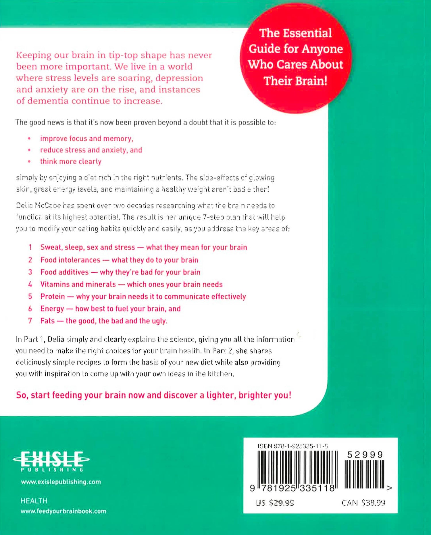 This is the ultimate guide to getting your brain in tip-top shape and keeping it healthy via the foods you eat. With a worldwide ageing population, and cases of dementia as well as severe depression and anxiety alarmingly on the rise, the need to look after your brain optimally has never been more important. It has now been proven beyond a doubt that it is possible to improve focus and memory, reduce stress and anxiety, and think more clearly simply by enjoying a diet rich in the right nutrients. In Part 1 of Feed Your Brain, Delia takes you through her 7-step program, simply and clearly explaining the science behind how the brain works, and showing how vitamins, minerals, fats, oils, carbohydrates and proteins affect brain function. Part 2 of the book features delicious, quick and easy recipes that can form the basis of your new diet while also providing you with inspiration to come up with your own ideas in the kitchen.