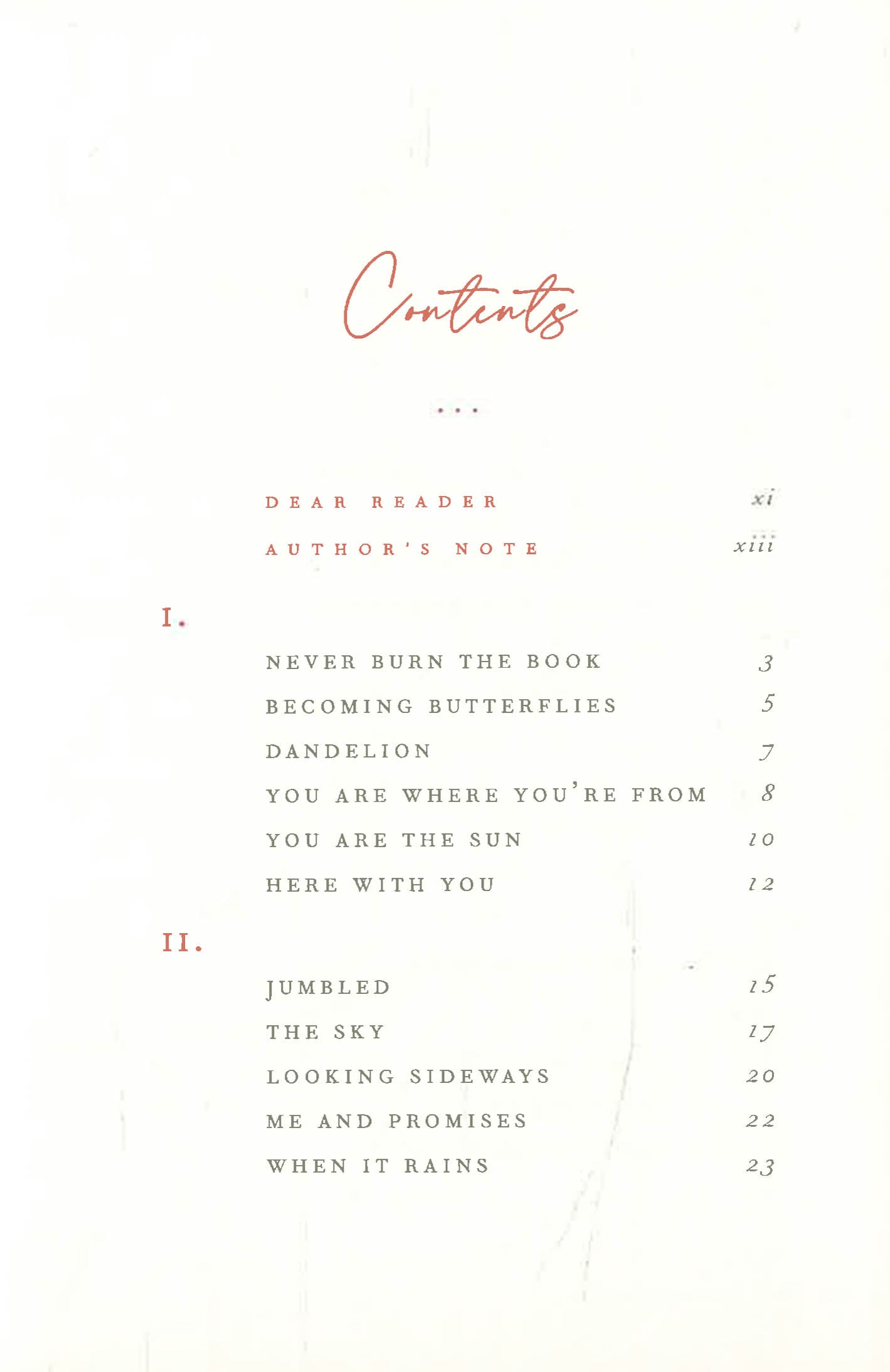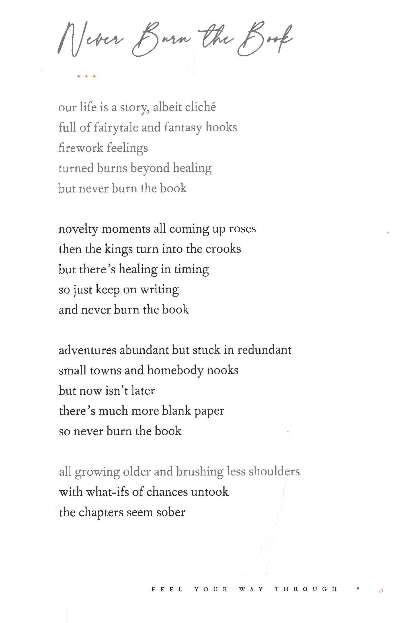 "I've realized that some feelings can't be turned into a song . . . so I've started writing poems. Just like my songs, they are personal and honest. Just like my songs, they have hooks and rhymes. Just like my songs, they talk about what it's like to be twenty-something trying to navigate a wildly beautiful and broken world."