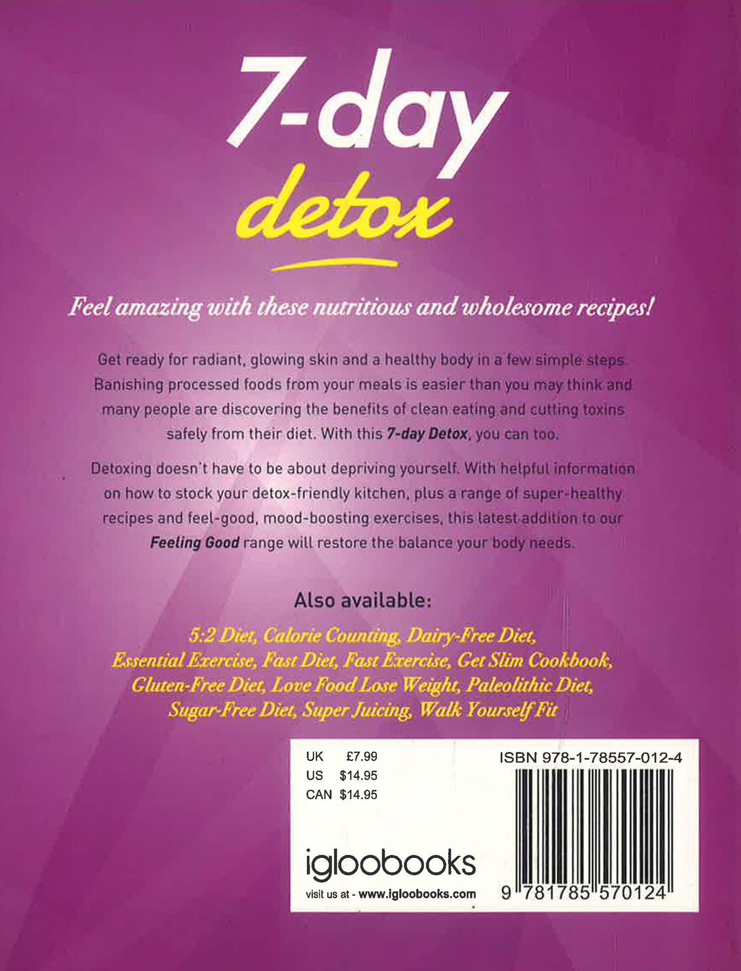 Get ready for radiant, glowing skin and a healthy body in a few simple steps Banishing processed foods from your meals is easier than you may think and many people are discovering the benefits of clean eating and cutting toxins safely from their diet. With this 7-day Detox, you can too. Detoxing doesn?t have to be about depriving yourself. With helpful information on how to stock your detox-friendly kitchen, plus a range of super-healthy recipes and feel-good, mood-boosting exercises, this latest addition to our Feeling Good range will restore the balance your body needs.