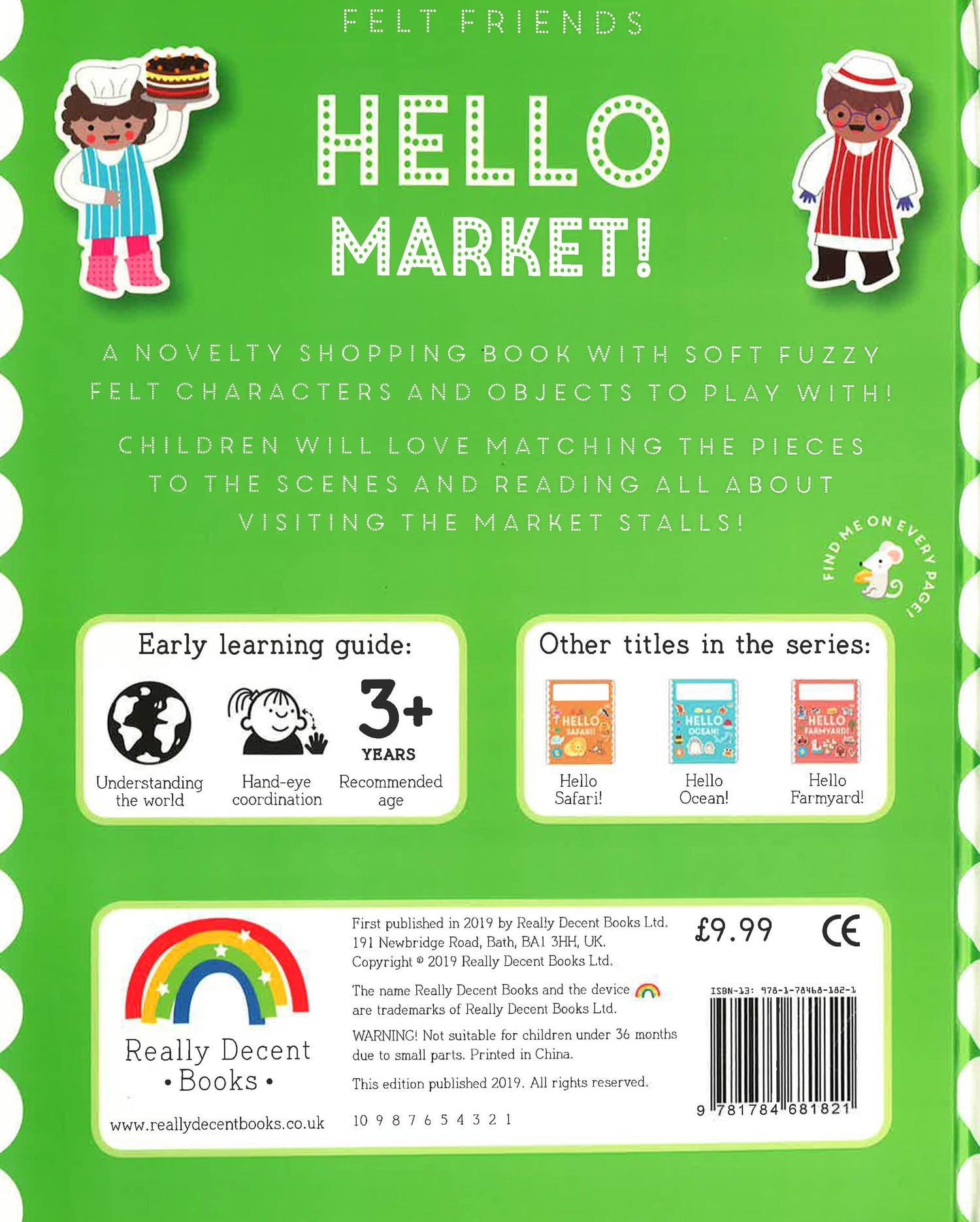A novelty shopping book with soft fuzzy felt characters and objects to play with! Children will love matching the pieces to the scene and reading all about visiting the market stalls!