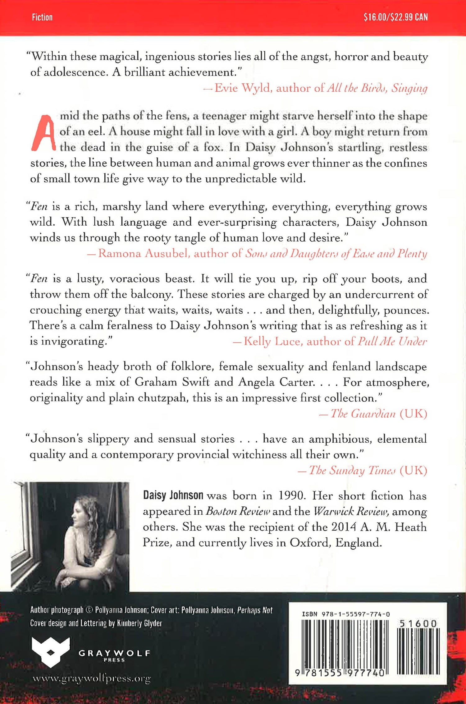 Daisy Johnson's Fen, set in the fenlands of England, transmutes the flat, uncanny landscape into a rich, brooding atmosphere. From that territory grow stories that blend folklore and restless invention to turn out something entirely new. Amid the marshy paths of the fens, a teenager might starve herself into the shape of an eel. A house might fall in love with a girl and grow jealous of her friend. A boy might return from the dead in the guise of a fox. Out beyond the confines of realism, the familiar instincts of sex and hunger blend with the shifting, unpredictable wild as the line between human and animal is effaced by myth and metamorphosis. With a fresh and utterly contemporary voice, Johnson lays bare these stories of women testing the limits of their power to create a startling work of fiction.