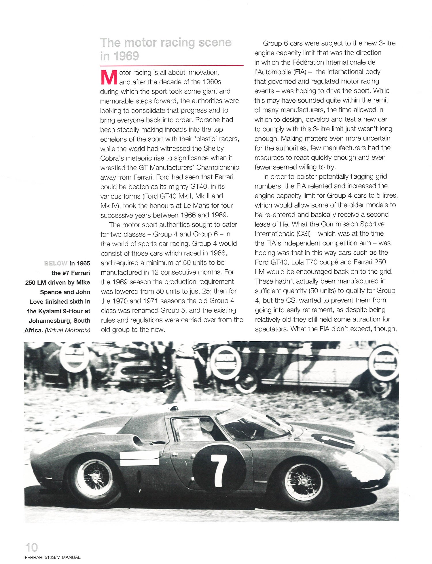 The Ferrari 512S, and its successor the 512M are among the most iconic of Ferrari sports-racing cars. These cars competed against Porsche's all-conquering 917 in 1970 and 1971 - a rivalry immortalised in Steve McQueen's film Le Mans. The car was powered by a 5-litre V-12 engine, and was driven by an impressive portfolio of drivers including Mario Andretti, John Surtees, Clay Regazzoni, Jacky Ickx, Ronnie Peterson and Derek Bell. Although the performance of the Porsche and Ferrari were very similar, the Porsche 917 benefitted from greater reliability, and the Ferraris were unable to challenge the dominance of the German manufacturer before the rules were amended for 1972, effectively outlawing the 5-litre-capacity engines used in both the Ferrari 512 and Porsche 917. In spite of only winning a single World Championship race - the 12 Hours of Sebring in 1970 - the Ferrari 512S/M has secured a place as one of the most charismatic sports-racing cars ever built, and the sight and sound of a restored example in full flight today still turns heads.