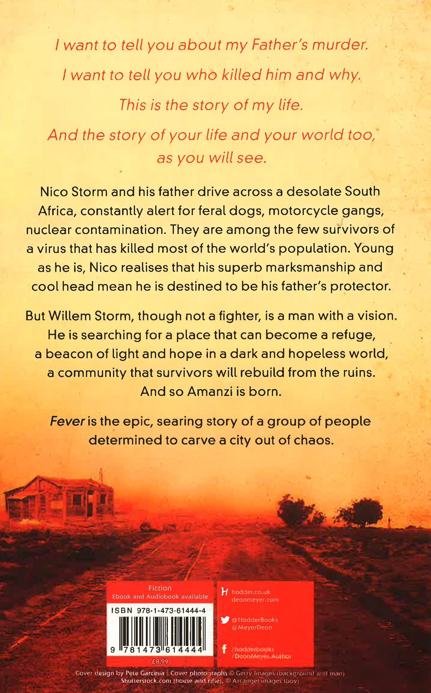 A stunning standalone thriller from the leading crime writer in South Africa, author of the best-selling Benny Griessel series. UK readers, you have a nice surprise coming. No, not Brexit, FEVER, by Deon Meyer. Reminiscent of THE STAND and THE PASSAGE. Great stuff' STEPHEN KINGI want to tell you about my Father's murder.I want to tell you who killed him and why.This is the story of my life.And the story of your life and your world too, as you will see.Nico Storm and his father drive across a desolate South Africa, constantly alert for feral dogs, motorcycle gangs, nuclear contamination. They are among the few survivors of a virus that has killed most of the world's population. Young as he is, Nico realises that his superb marksmanship and cool head mean he is destined to be his father's protector.But Willem Storm, though not a fighter, is a man with a vision. He is searching for a place that can become a refuge, a beacon of light and hope in a dark and hopeless world, a community that survivors will rebuild from the ruins. And so Amanzi is born. Fever is the epic, searing story of a group of people determined to carve a city out of chaos.