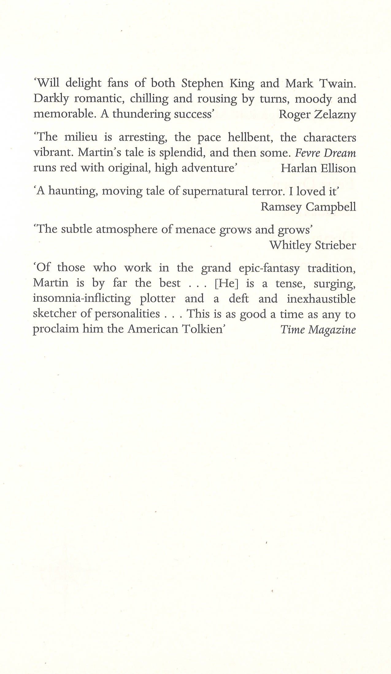 Abner Marsh has had his dearest wish come true - he has built the Fevre Dream, the finest steamship ever to sail the Mississippi. Abner hopes to race the boat someday, but his partner is making it hard for him to realise his ambition. Joshua York put up the money for the Fevre Dream, but now rumours have started about the company he keeps, his odd eating habits and strange hours. As the Dream sails the great river, it leaves in its wake one too many dark tales, until Abner is forced to face down the man who helped to make his dreams become reality.