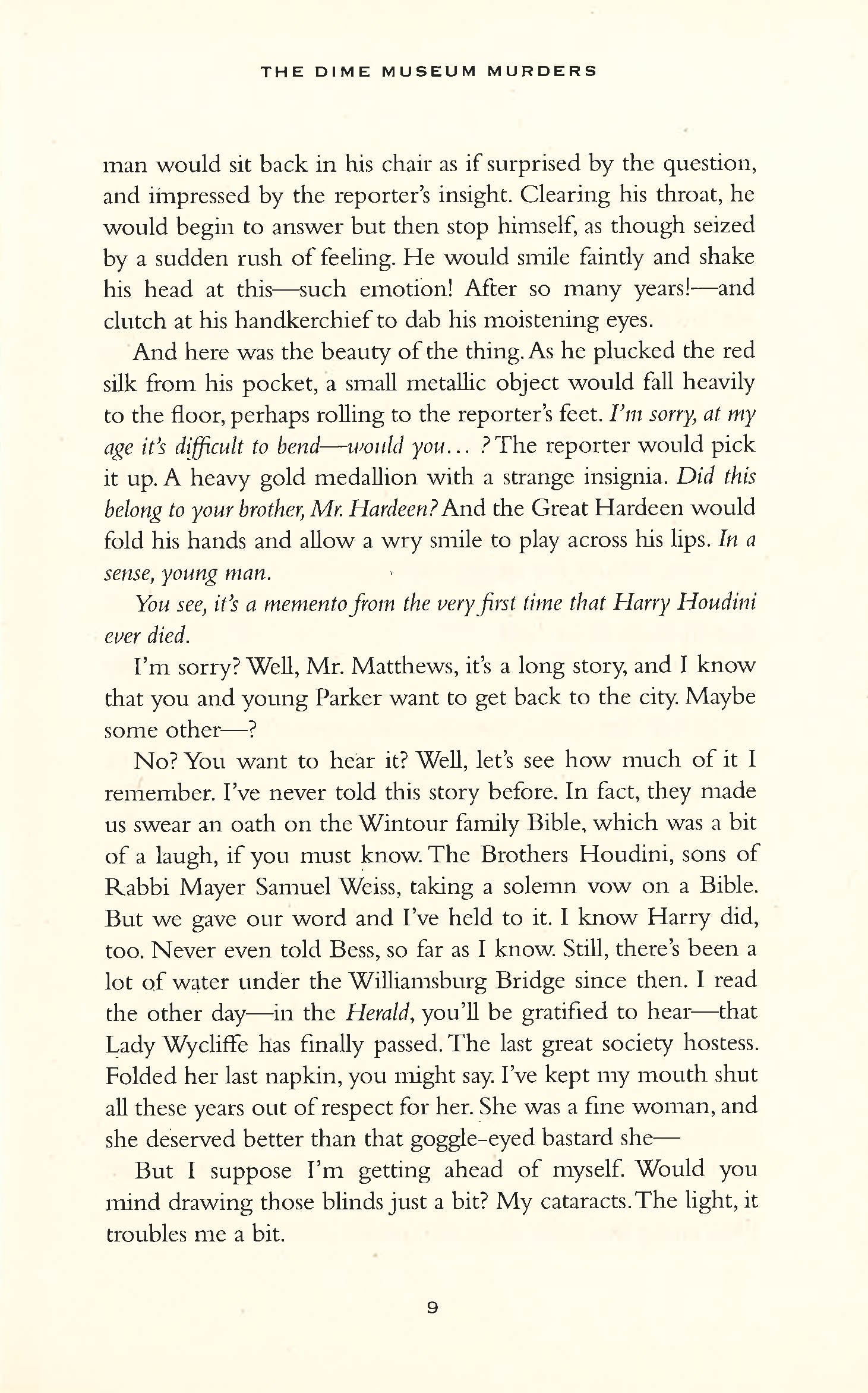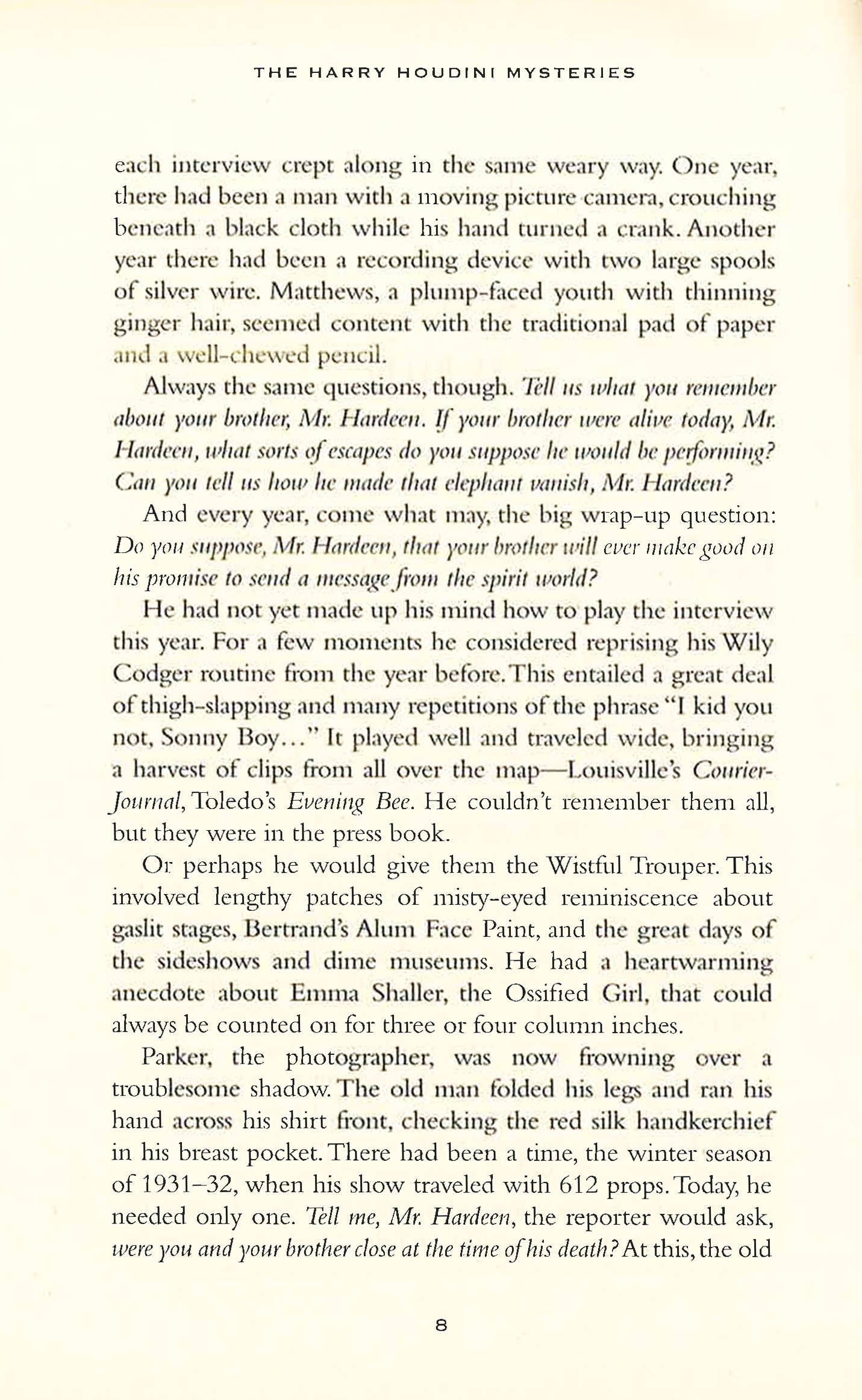 New York City in 1897 and young Harry Houdini is struggling to make it in the brutal entertainment business, when detectives call on him to attempt the most amazing feat of his fledgling career: solve the mystery of a toy tycoon murdered in his posh Fifth Avenue mansion. It's a challenge which Harry - never at a loss for self-confidence - is more than willing to accept.