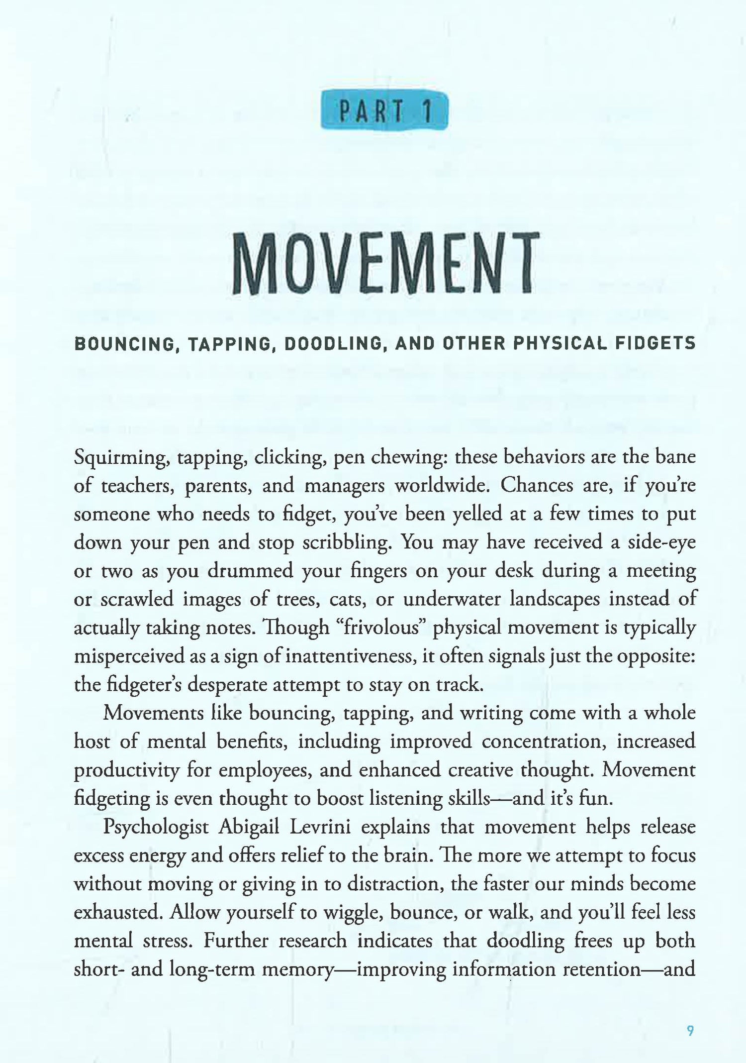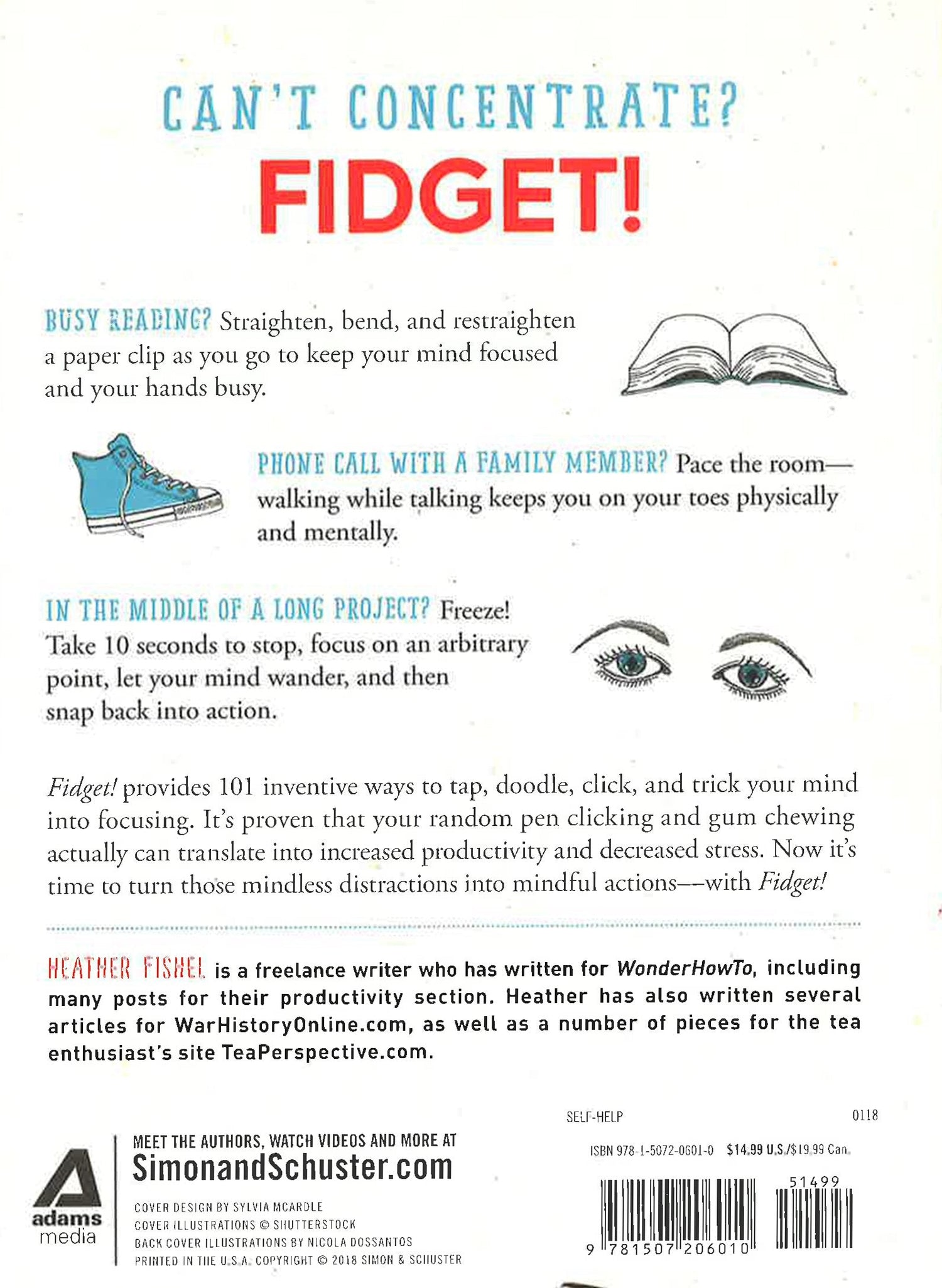Busy hands equal a happy brain! Learn how fidgeting can help increase productivity and decrease stress, with 101 ways to tap, jiggle, doodle, and click your way to better concentration and creativity. Fidget spinners are the latest popular trend, but pen clicking, pencil chewing, and stress-ball slinging have been commonplace for decades. According to recent research, it's been shown that fidgeting helps you concentrate and prevent stress. If something we are working on isn't interesting enough to hold our attention, the additional sensory-motor input of fidgeting allows our brains to become fully engaged and focused. In Fidget! you'll discover 101 ways to help increase your productivity and decrease stress, so you can fully engage at work and achieve calm, creativity, and mindfulness.