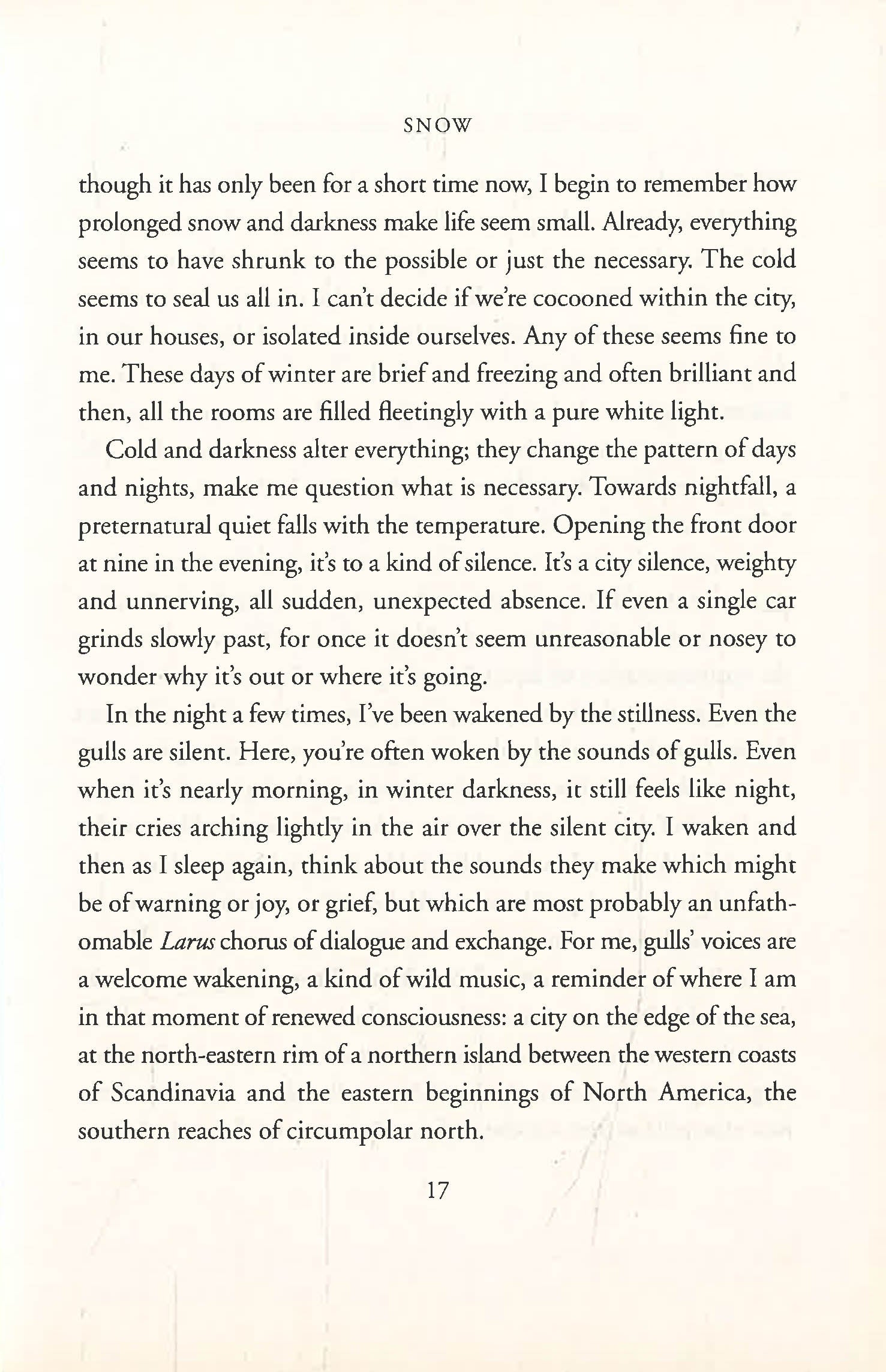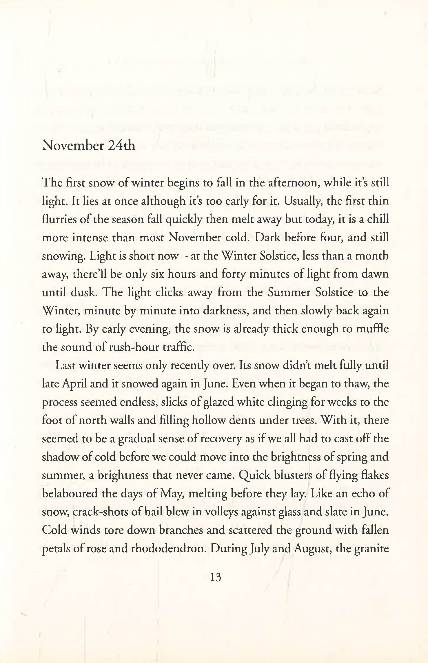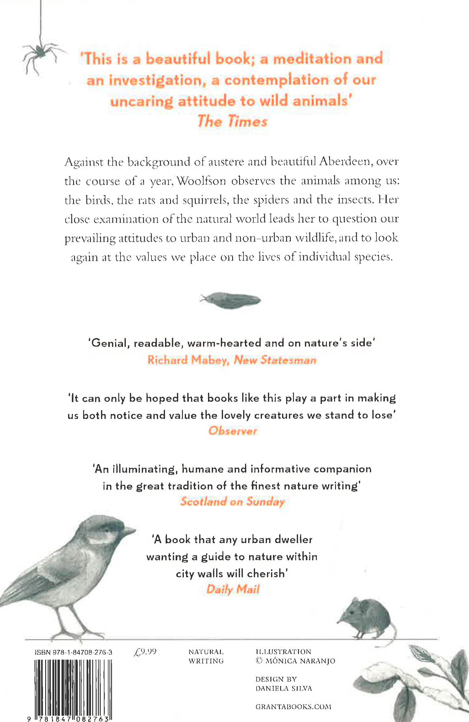 Against the background of austere and beautiful Aberdeen, Woolfson observes the seasons, the streets and the quiet places of her city over the course of a year. She considers the geographic, atmospheric and environmental elements which bring diverse life forms together in close proximity, and in absorbing prose writes of the animals among us: the birds, the rats and squirrels, the spiders and the insects. Her close examination of the natural world leads her to question our prevailing attitudes to urban and non-urban wildlife, and to look again at the values we place on the lives of individual species.