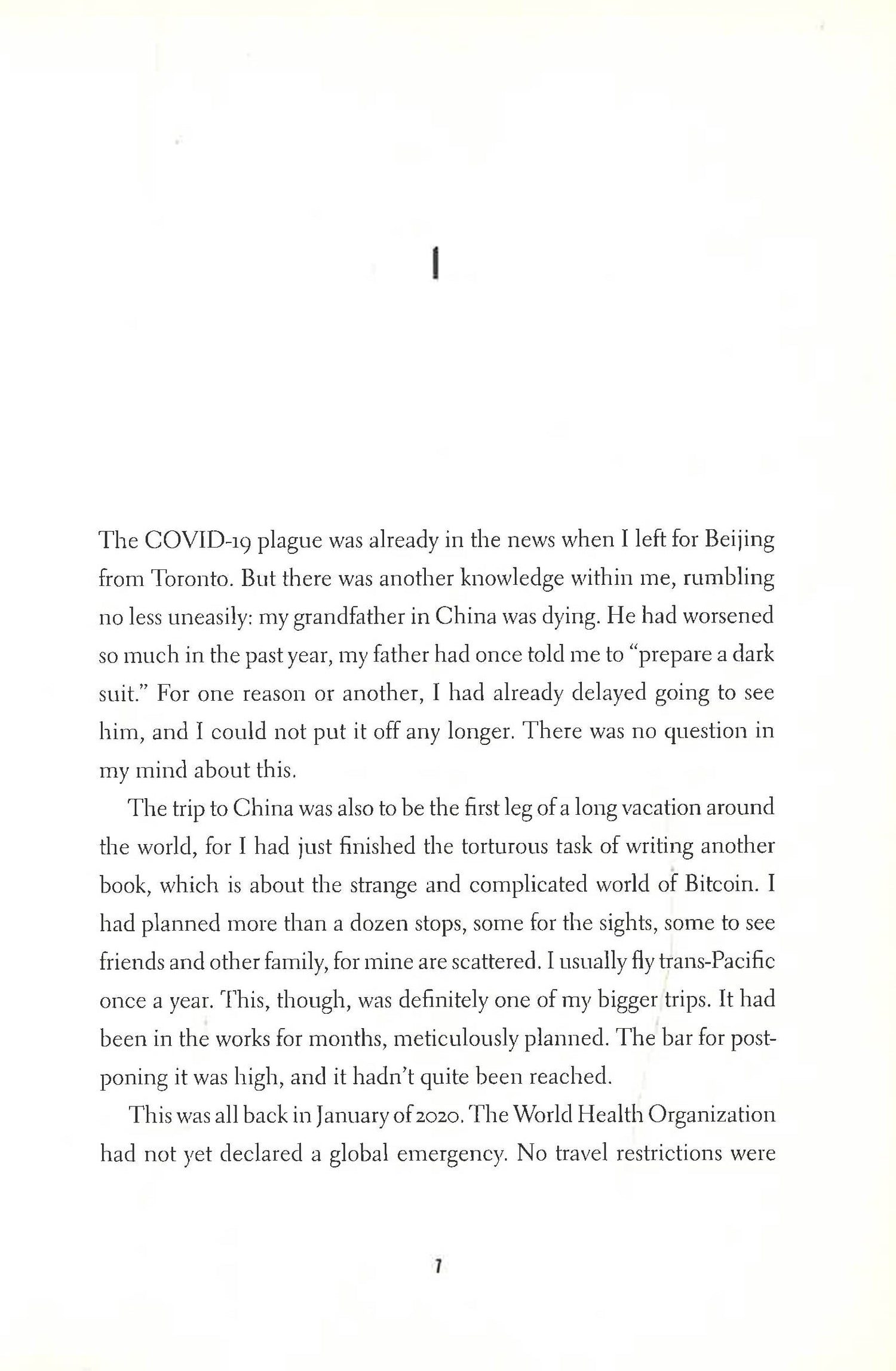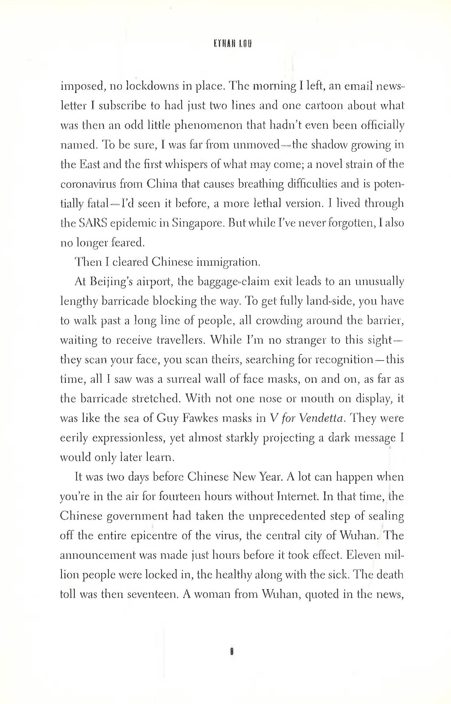 Visiting Beijing in January 2020 to see his dying grandfather, the Canadian journalist Ethan Lou unknowingly walks into a state under siege. In his journey out of China and--unwittingly--into other hot zones in Asia and Europe, he finds himself witnessing the very earliest stages of a virus that will forever change the world as we know it.