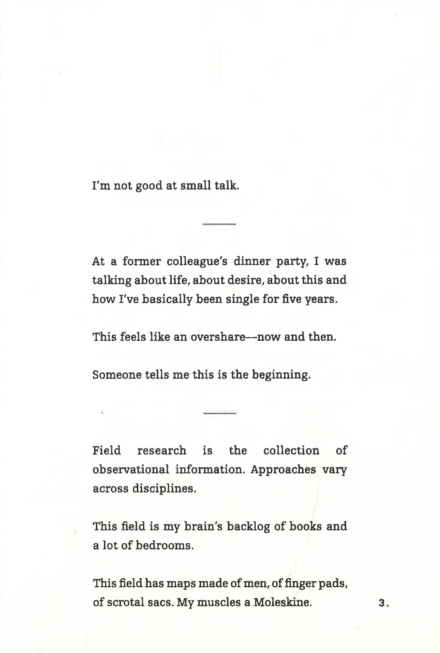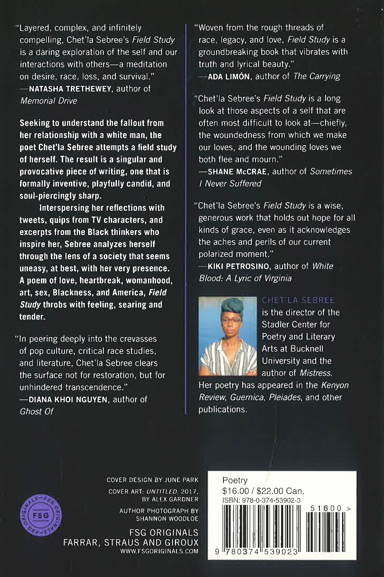 Seeking to understand the fallout of her relationship with a white man, the poet Chet'la Sebree attempts a field study of herself. Scientifically, field studies are objective collections of raw data, devoid of emotion. But during the course of a stunning lyric poem, Sebree's control over her own field study unravels as she attempts to understand the depth of her feelings in response to the data of her life. The result is a singular and provocative piece of writing, one that is formally inventive, playfully candid, and soul-piercingly sharp.
