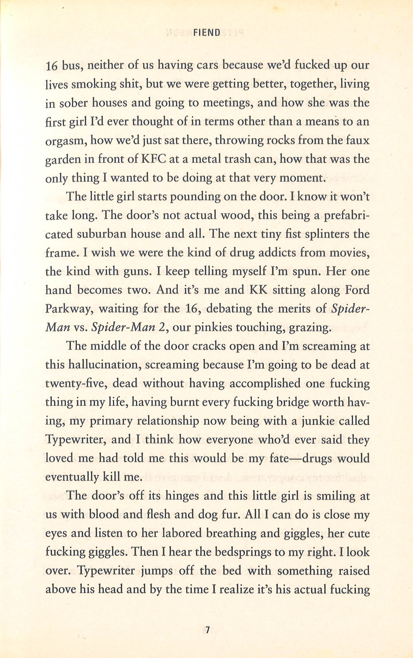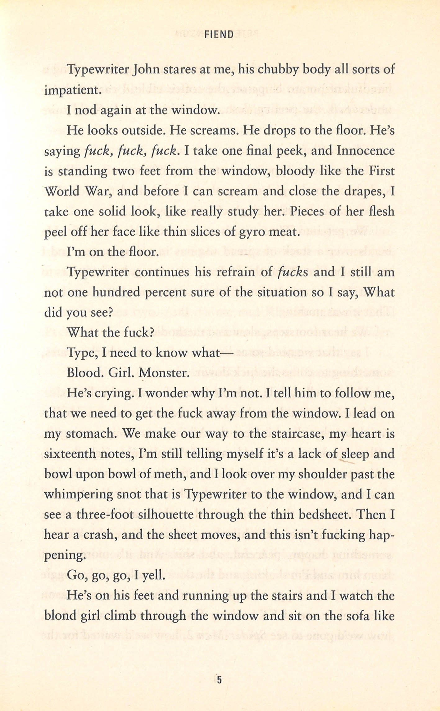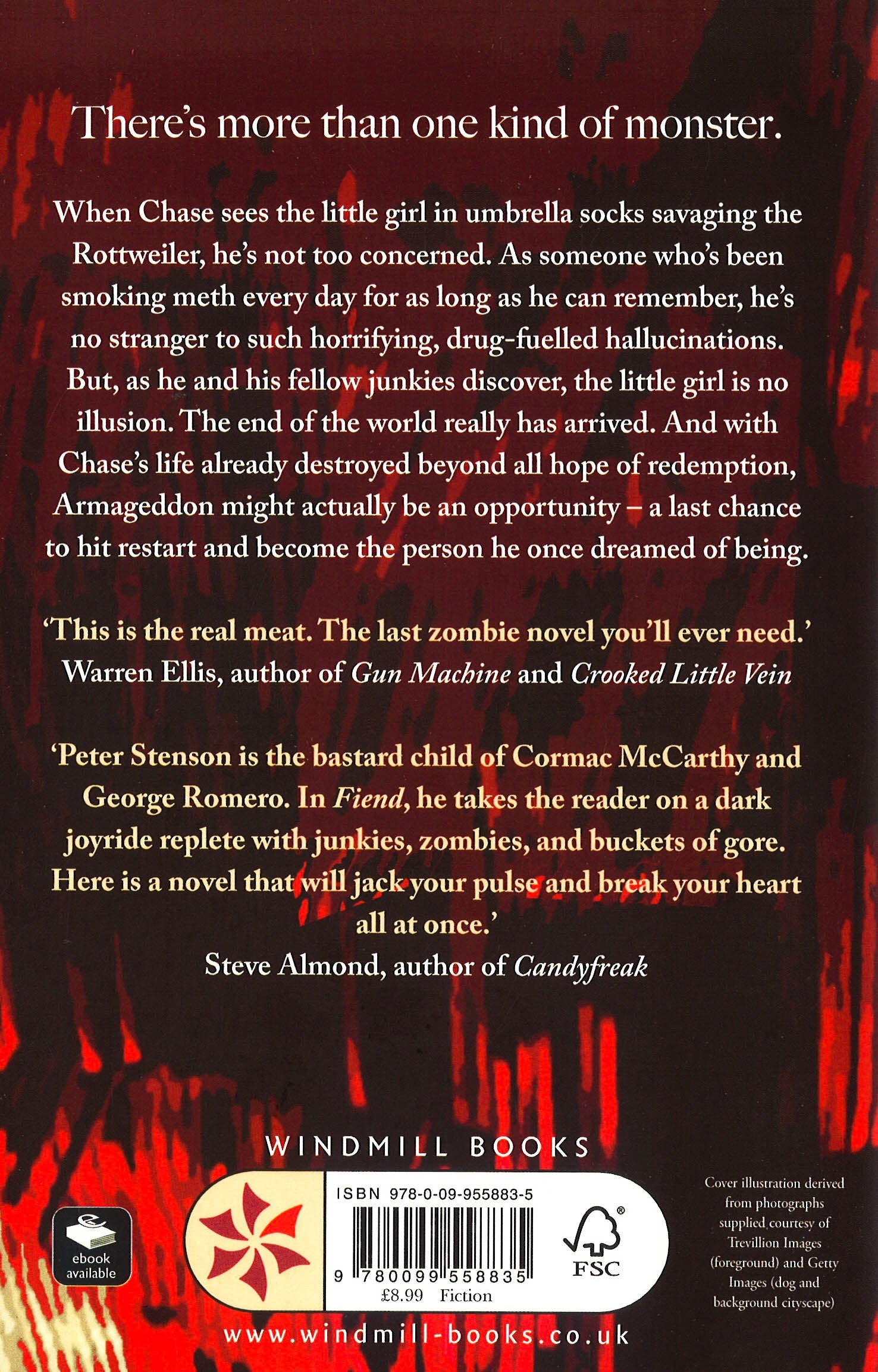 Breaking Bad' meets 'Night of the Living Dead" in this manically energetic, stunningly written debut that pits a crystal meth addict against the zombie apocalypse. When "Chase" sees the little girl in umbrella socks savaging the Rottweiler, he's not too concerned. As someone who's been smoking meth every day for as long as he can remember, he's no stranger to such horrifying, drug-fueled hallucinations. But the little girl is no illusion. The end of the world really has arrived. And with "Chase's" life already destroyed beyond all hope of redemption, armageddon might actually be an opportunity - a last chance to hit restart and become the person he once dreamed of being. Soon "Chase" is fighting to reconnect with his lost love and dreaming of becoming her hero among the ruins. But is salvation just another pipe dream? Propelled by a blistering voice and featuring a powerfully compelling anti-hero, Fiend is at once a brilliant portrait of addiction, a pitch-black comedy, and the darkest, most twisted love story you've ever read - not to mention one hell of a zombie novel.