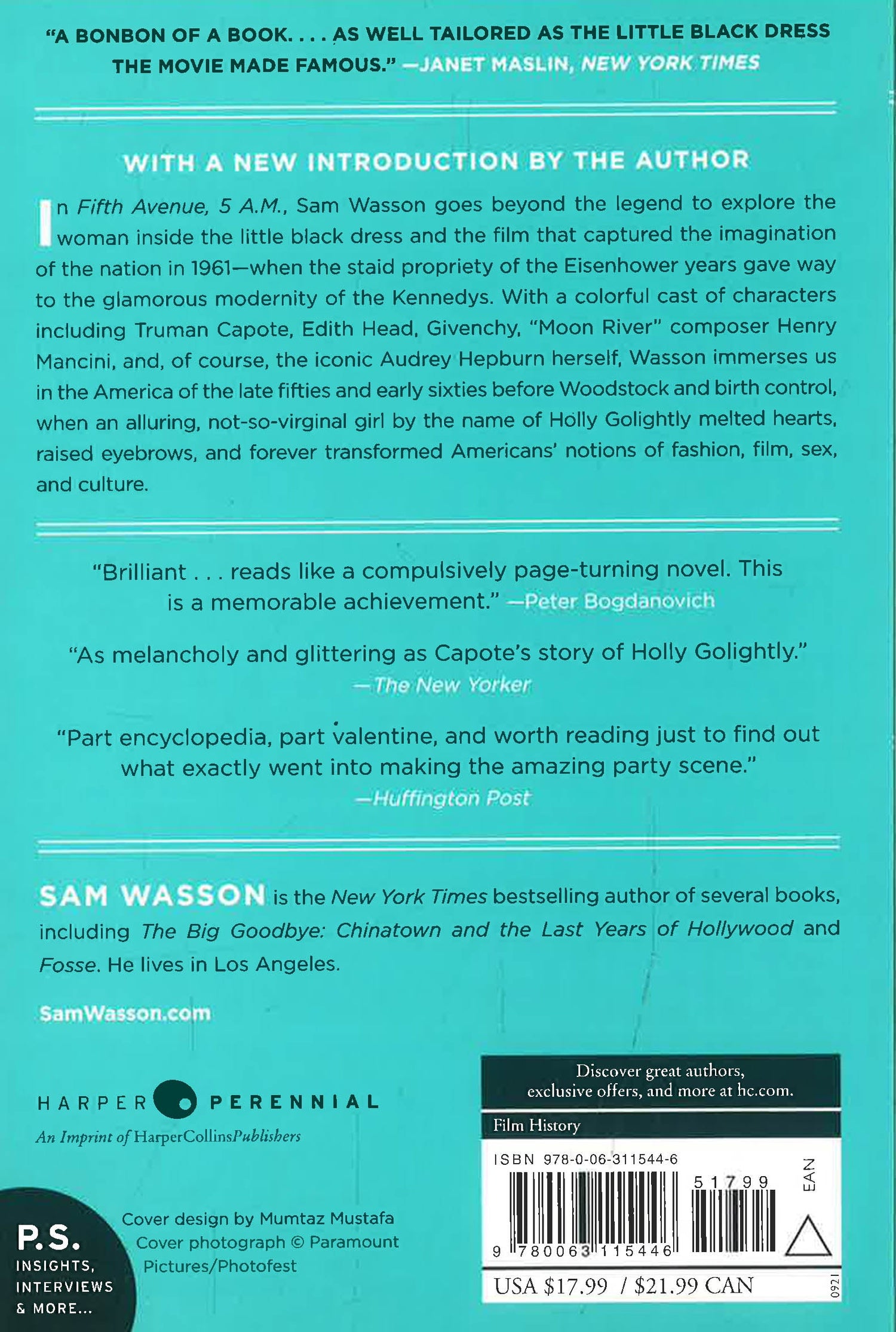 In Fifth Avenue, 5 A.M., Sam Wasson goes beyond the legend to explore the woman inside the little black dress and the film that captured the imagination of the nation in 1961—when the staid propriety of the Eisenhower years gave way to the glamorous modernity of the Kennedys. With a colorful cast of characters including Truman Capote, Edith Head, Givenchy, Moon River composer Henry Mancini, and, of course, the iconic Audrey Hepburn herself, Wasson immerses us in the America of the late fifties and early sixties before Woodstock and birth control, when an alluring, not-so-virginal girl by the name of Holly Golightly melted hearts, raised eyebrows, and forever transformed Americans’ notions of fashion, film, sex, and culture.
