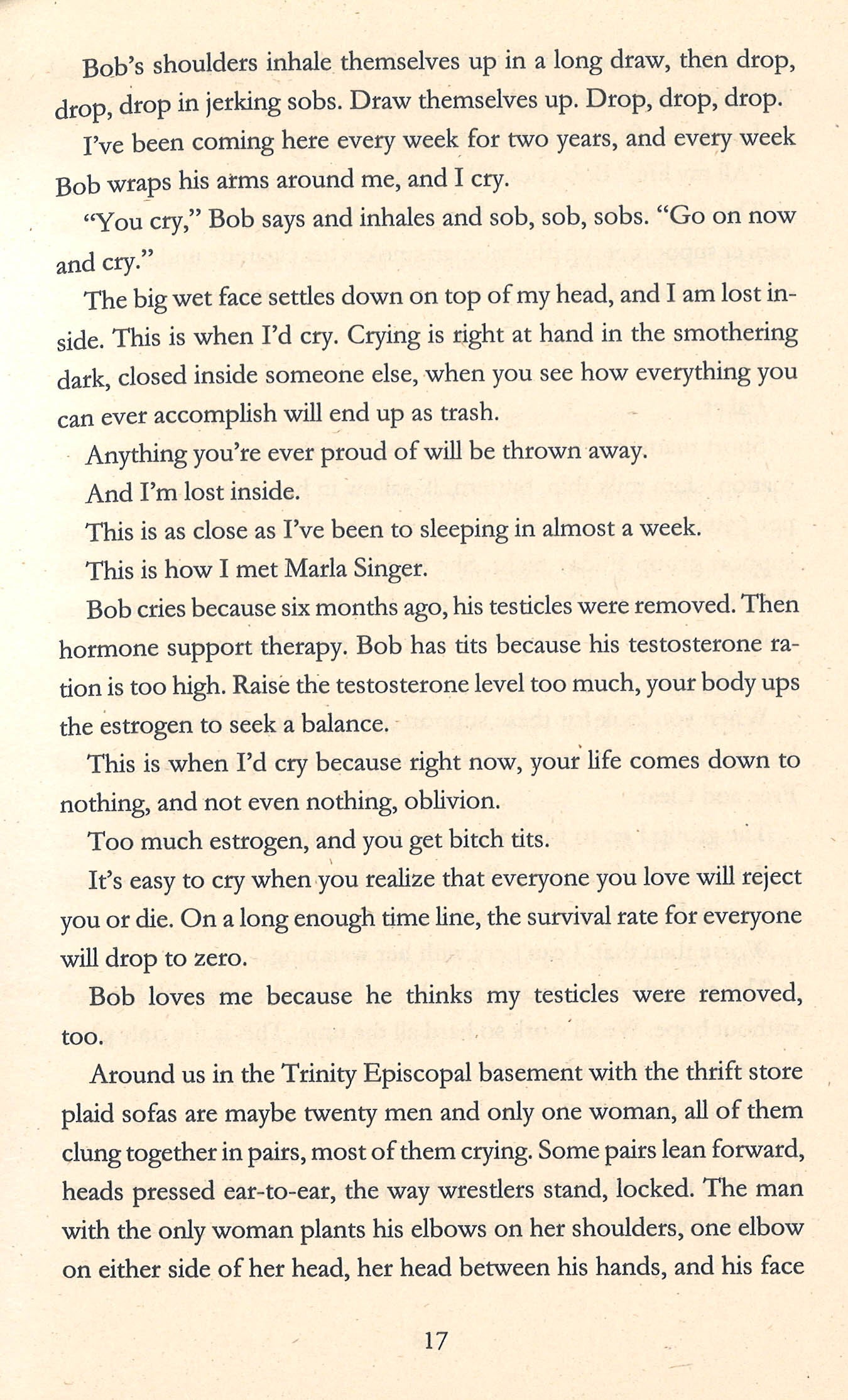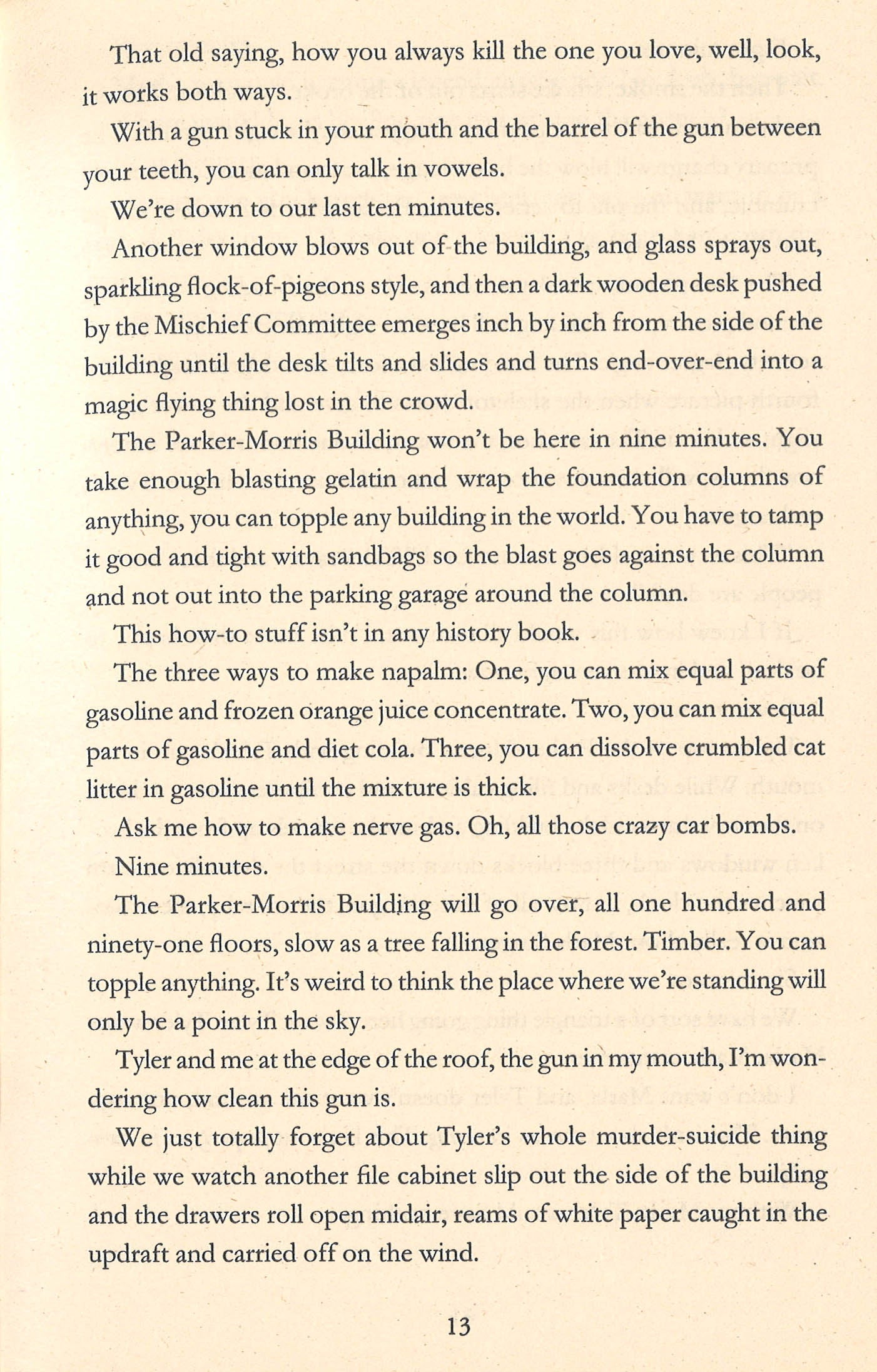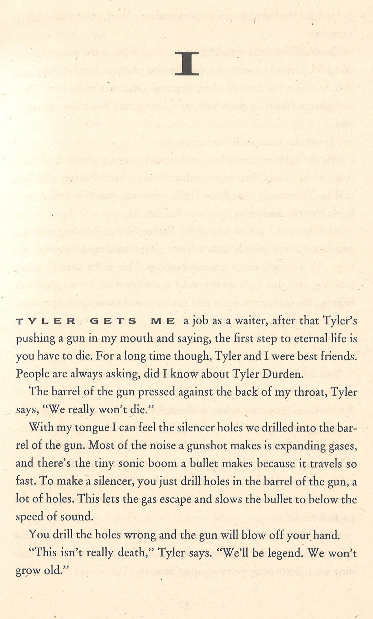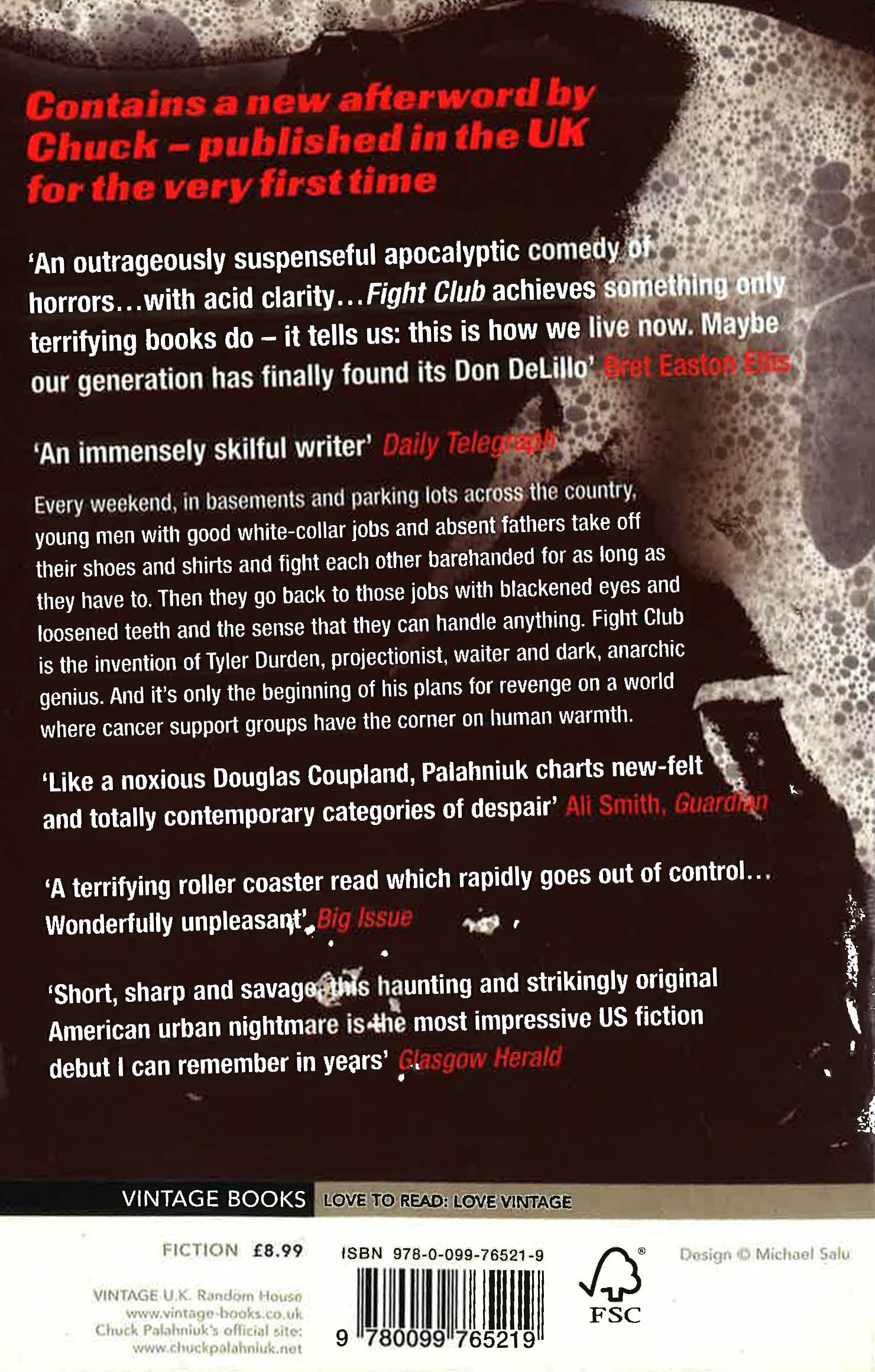 Every weekend, in basements and parking lots across the country, young men with good white-collar jobs and absent fathers take off their shoes and shirts and fight each other barehanded for as long as they have to. Then they go back to those jobs with blackened eyes and loosened teeth and the sense that they can handle anything. Fight Club is the invention of Tyler Durden, projectionist, waiter and dark, anarchic genius. And it's only the beginning of his plans for revenge on a world where cancer support groups have the corner on human warmth.