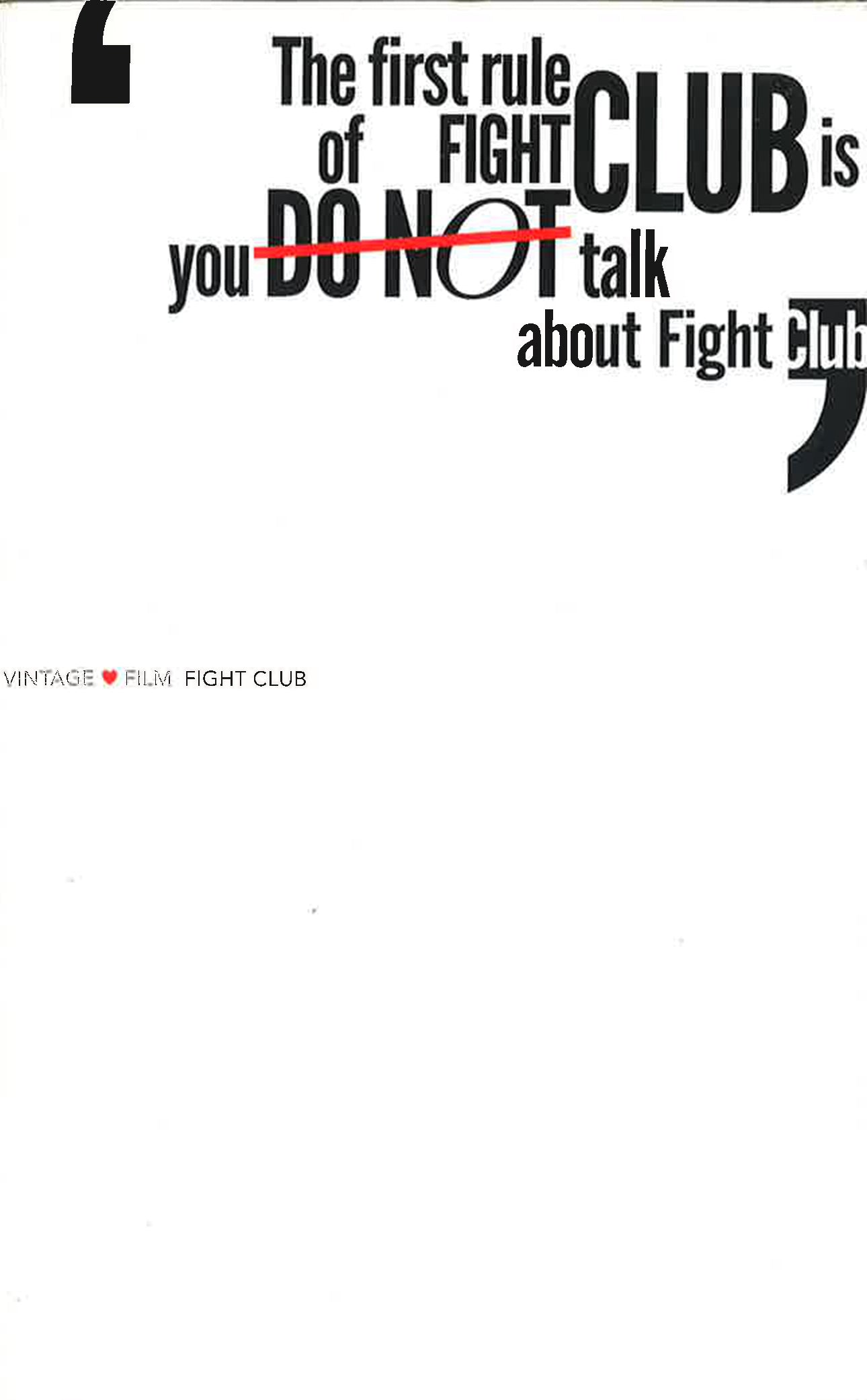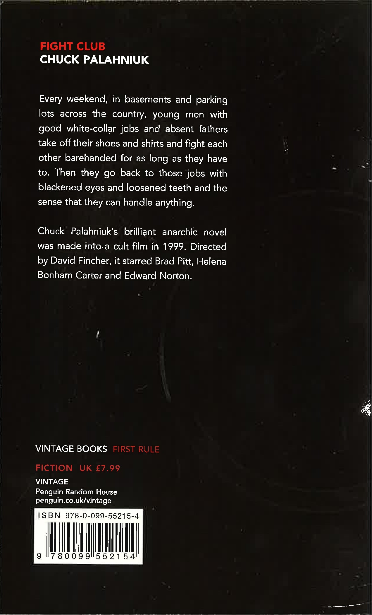 Every weekend, in basements and parking lots across the country, young men with good white-collar jobs and absent fathers take off their shoes and shirts and fight each other barehanded for as long as they have to. Then they go back to those jobs with blackened eyes and loosened teeth and the sense that they can handle anything. Fight Club is the invention of Tyler Durden, projectionist, waiter and dark, anarchic genius. And it's only the beginning of his plans for revenge on a world where cancer support groups have the corner on human warmth.