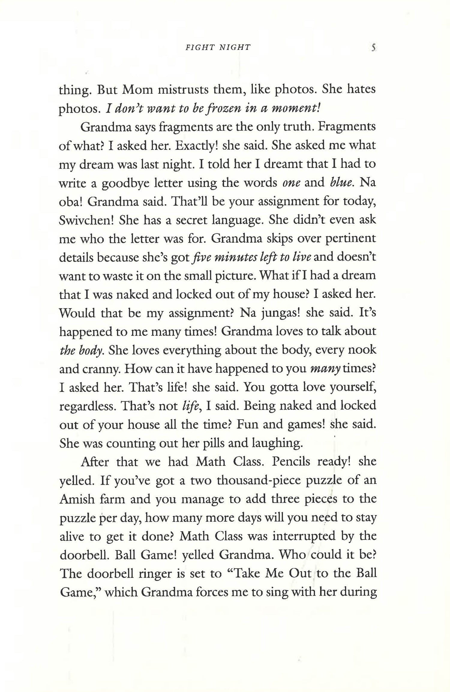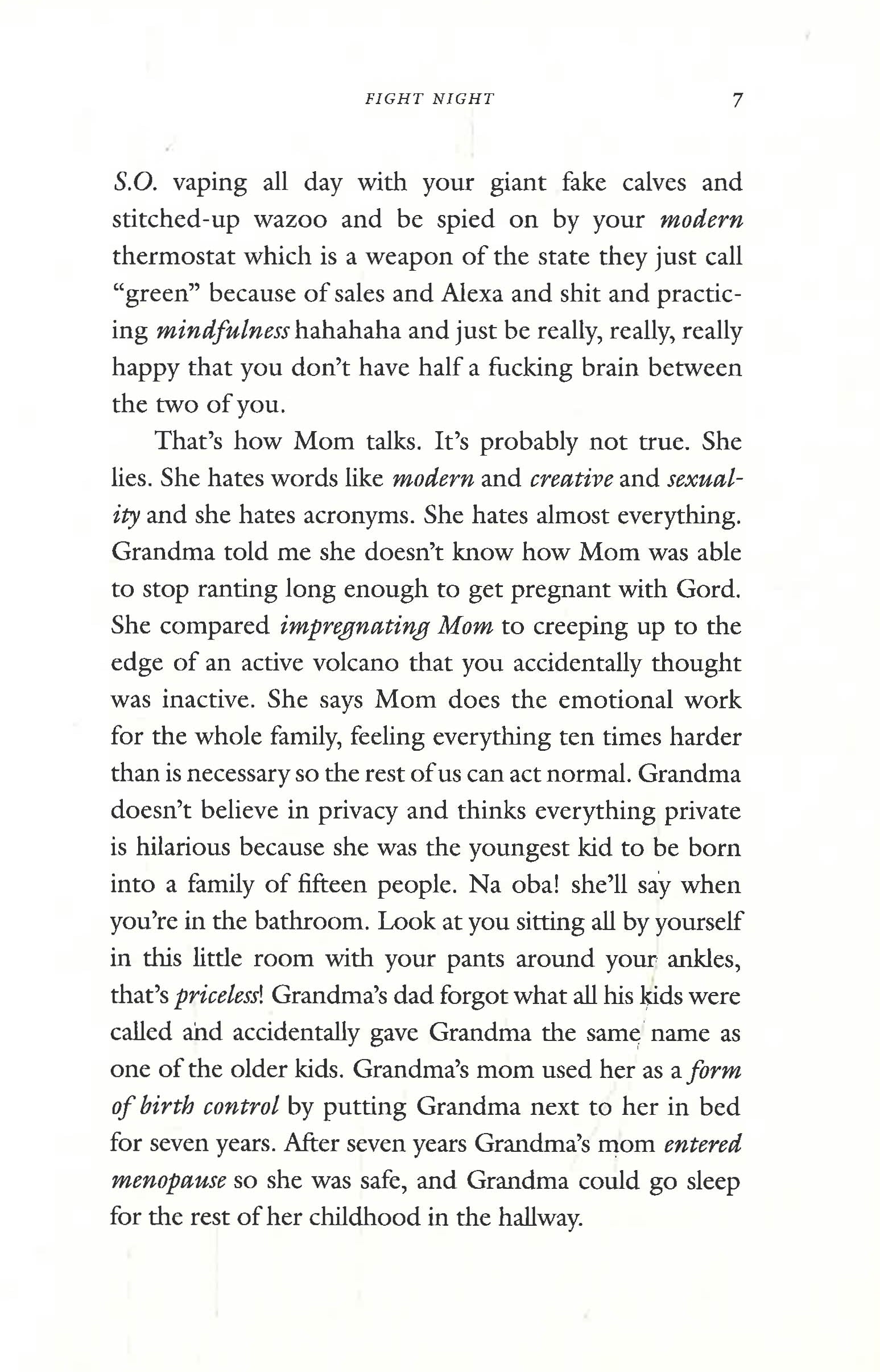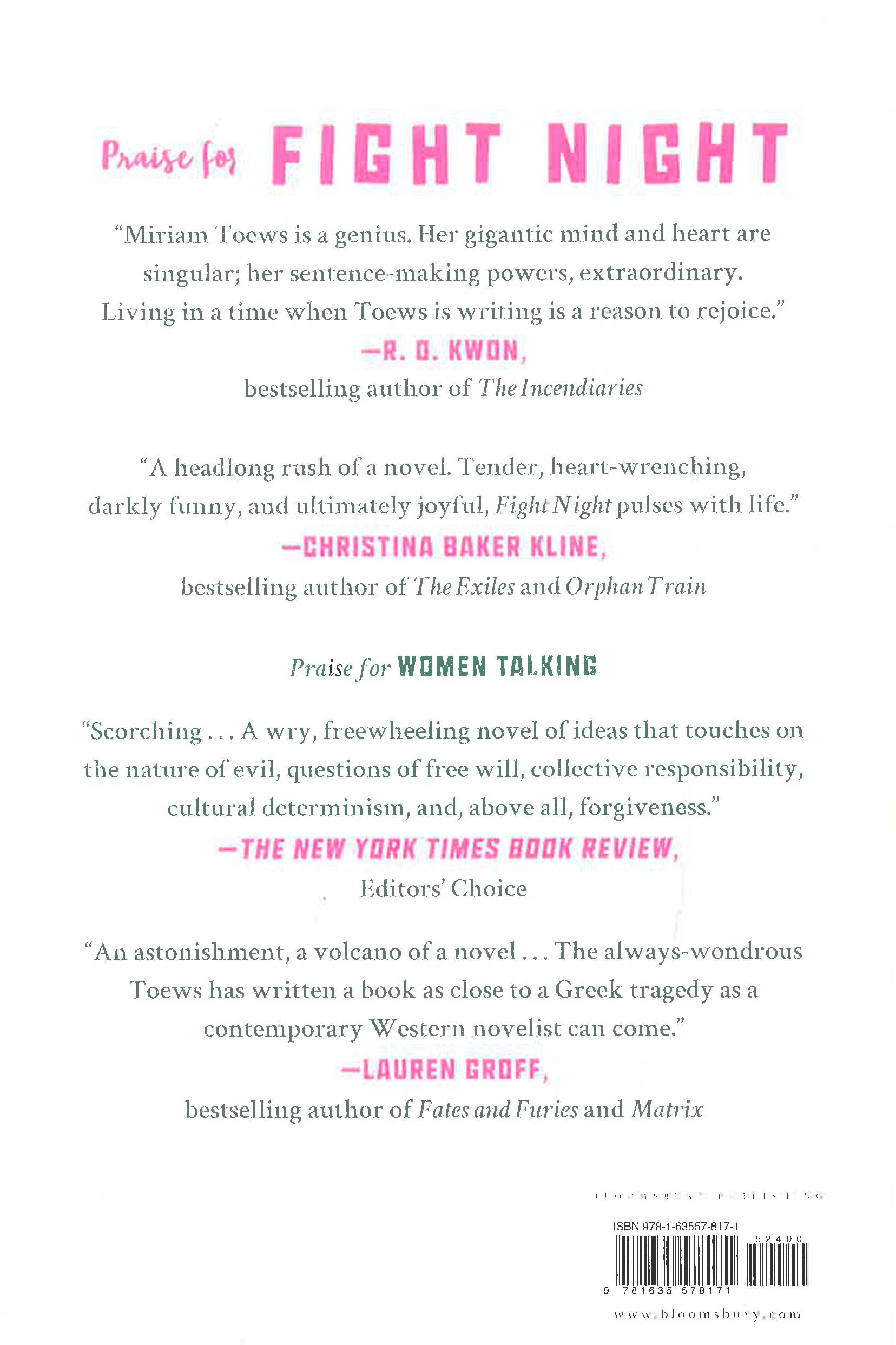 Alternating between the exuberant, precocious voice of young Swiv and her irrepressible, tenacious Grandma, Fight Night is a love letter to mothers and grandmothers, and to all the women who are still fighting-painfully, ferociously- for a way to live on their own terms.