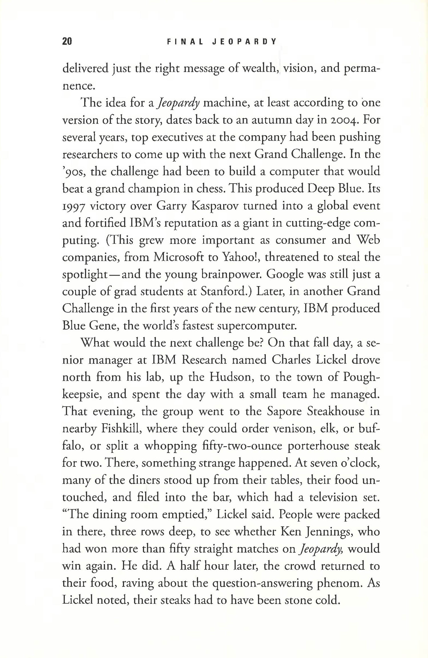 That vision has driven a team of engineers at IBM. Over three years, they created "Watson" and prepared it for a showdown on Jeopardy!, where it would take on two of the game's all-time champions, Ken Jennings and Brad Rutter, in a nationally televised event. Final Jeopardy is the entertaining, illuminating story of that computer and that epic match.