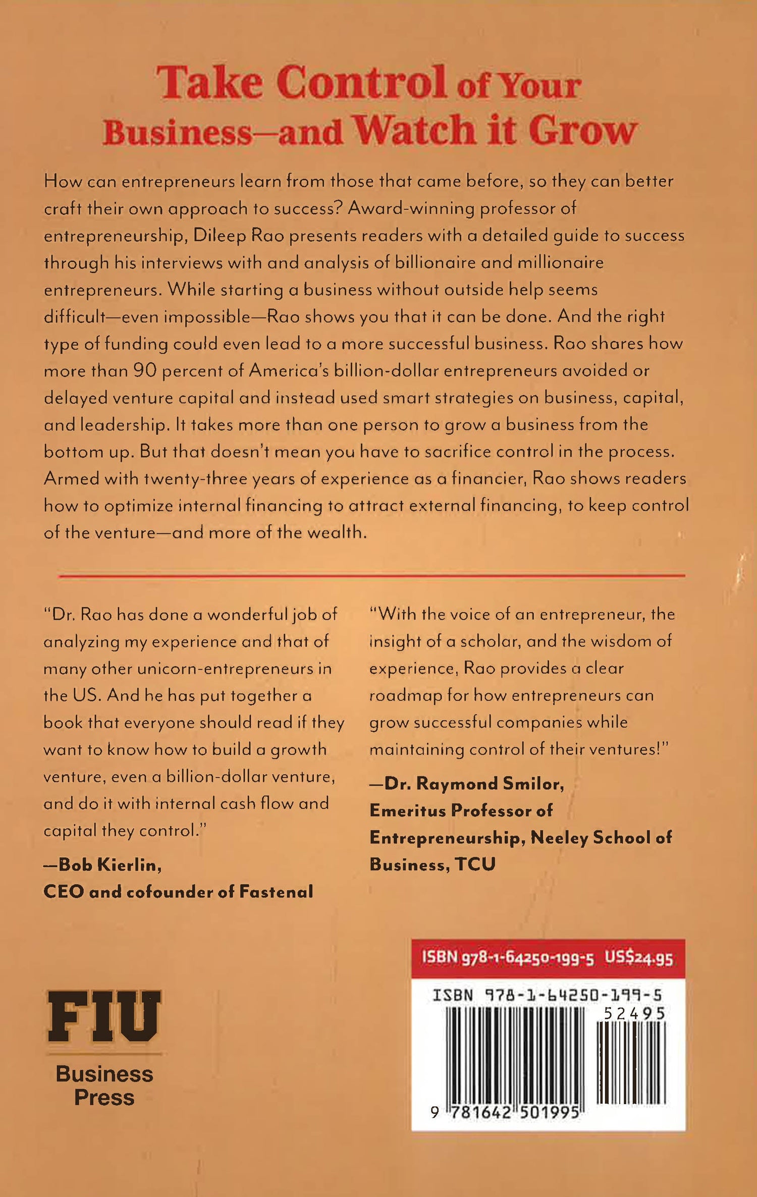 The right mix of internal and external financing. It takes more than one person to grow a business from the bottom up. But that doesn’t mean we have to sacrifice control of the venture in the process. Armed with 23 years of experience as a financer, Rao shows readers how to optimize internal financing so as to attract external financing. By keeping control of the venture, entrepreneurs keep more of the wealth, as well.