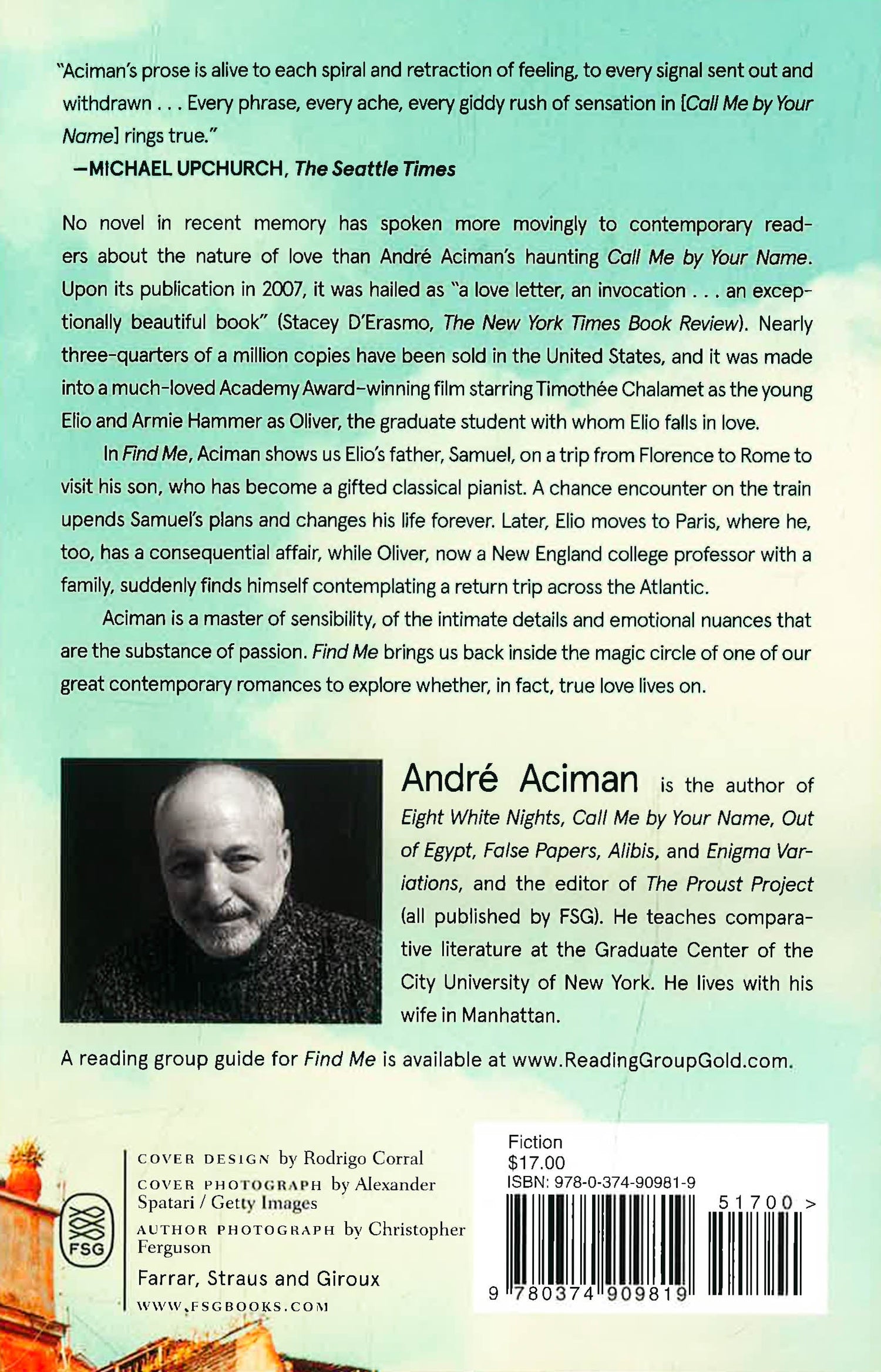 Aciman is a master of sensibility, of the intimate details and the emotional nuances that are the substance of passion. Find Me brings us back inside the magic circle of one of our greatest contemporary romances to ask if, in fact, true love ever dies.