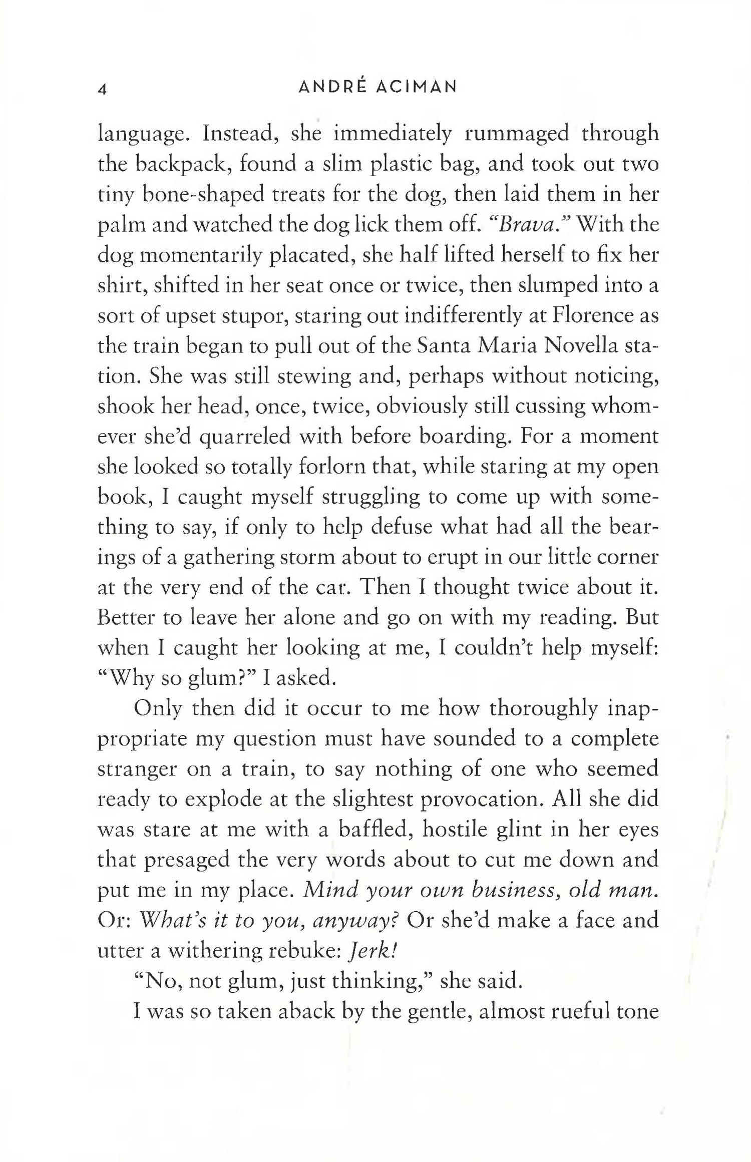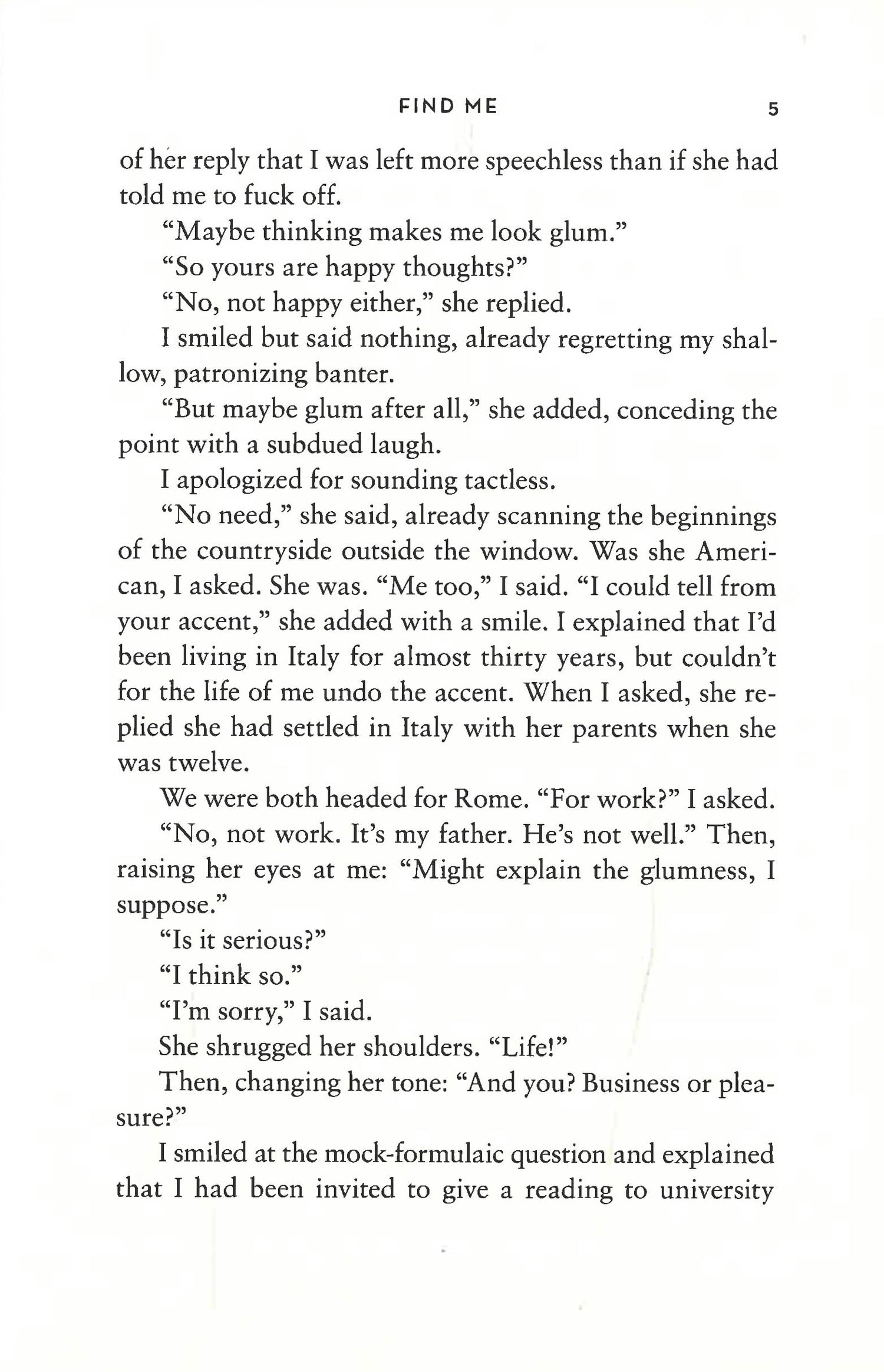 In Find Me, Aciman shows us Elio's father, Samuel, on a trip from Florence to Rome to visit Elio, who has become a gifted classical pianist. A chance encounter on the train with a beautiful young woman upends Sami's plans and changes his life forever.