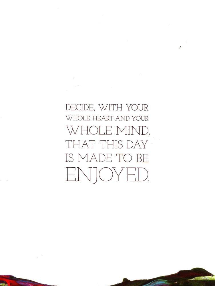 What are the ingredients of delight? What makes you feel bright and vibrant and alive? What could today offer that would make you look forward to tomorrow? Where do you find your happy? The answer to that question is yours. It is as unique and completely original as you are, and the answer you give today may not be the same as it will be tomorrow. Happiness is a day by day, hour by hour journey. The world offers you gifts every day, and you can decide what you will do with them, how you will make them into a life that is right, a life that is yours, a life where you know just how and where your happiness can be found.