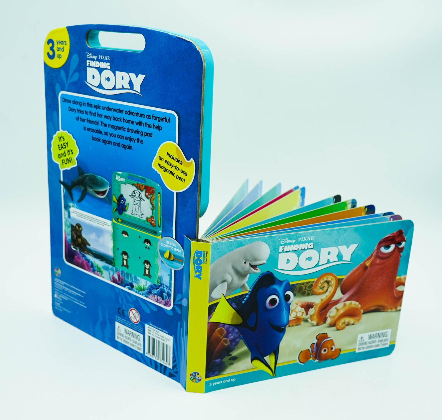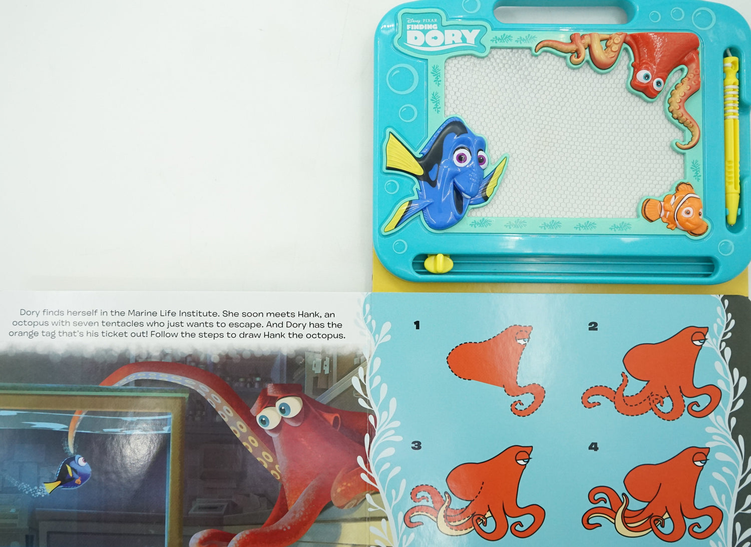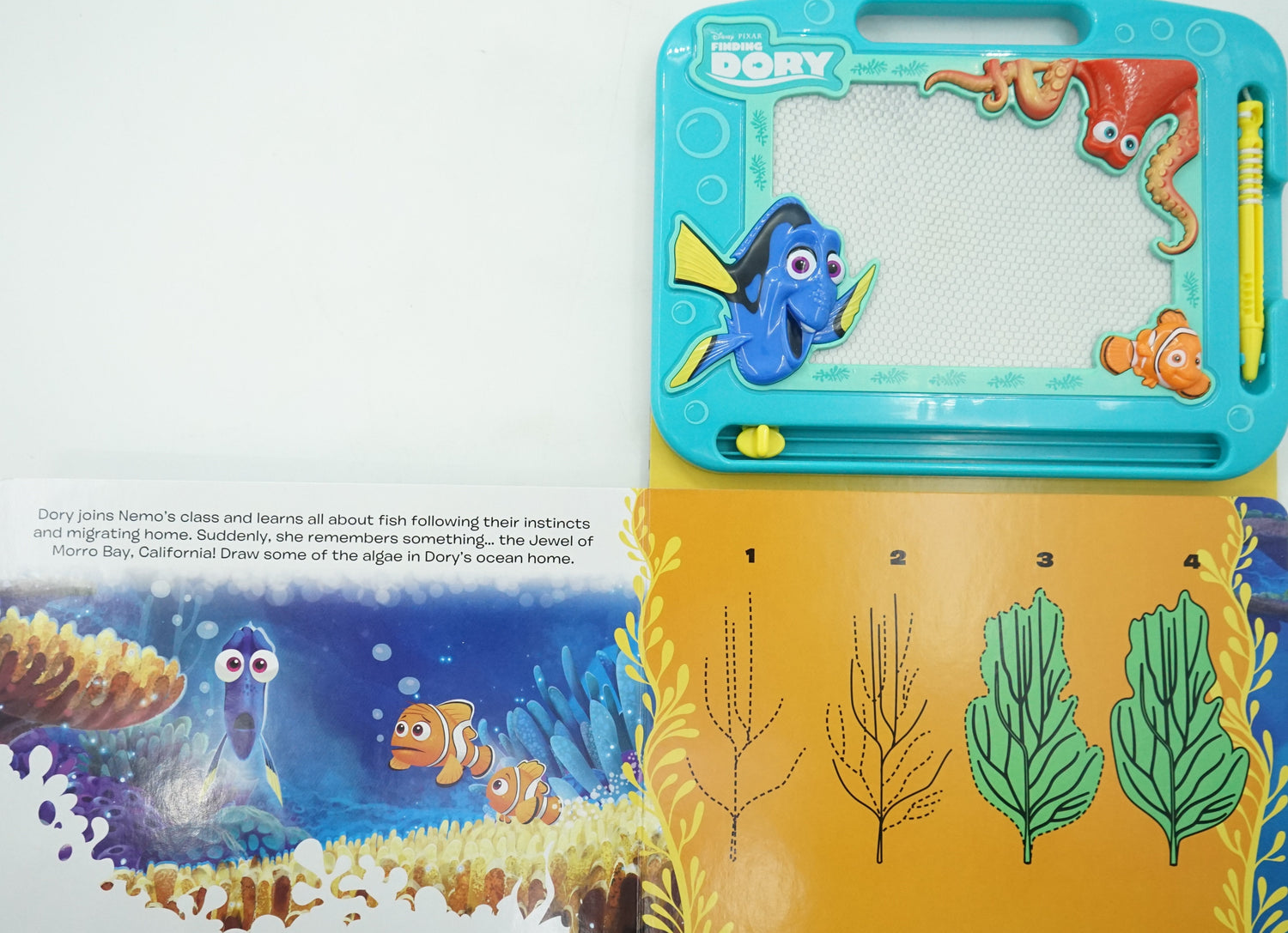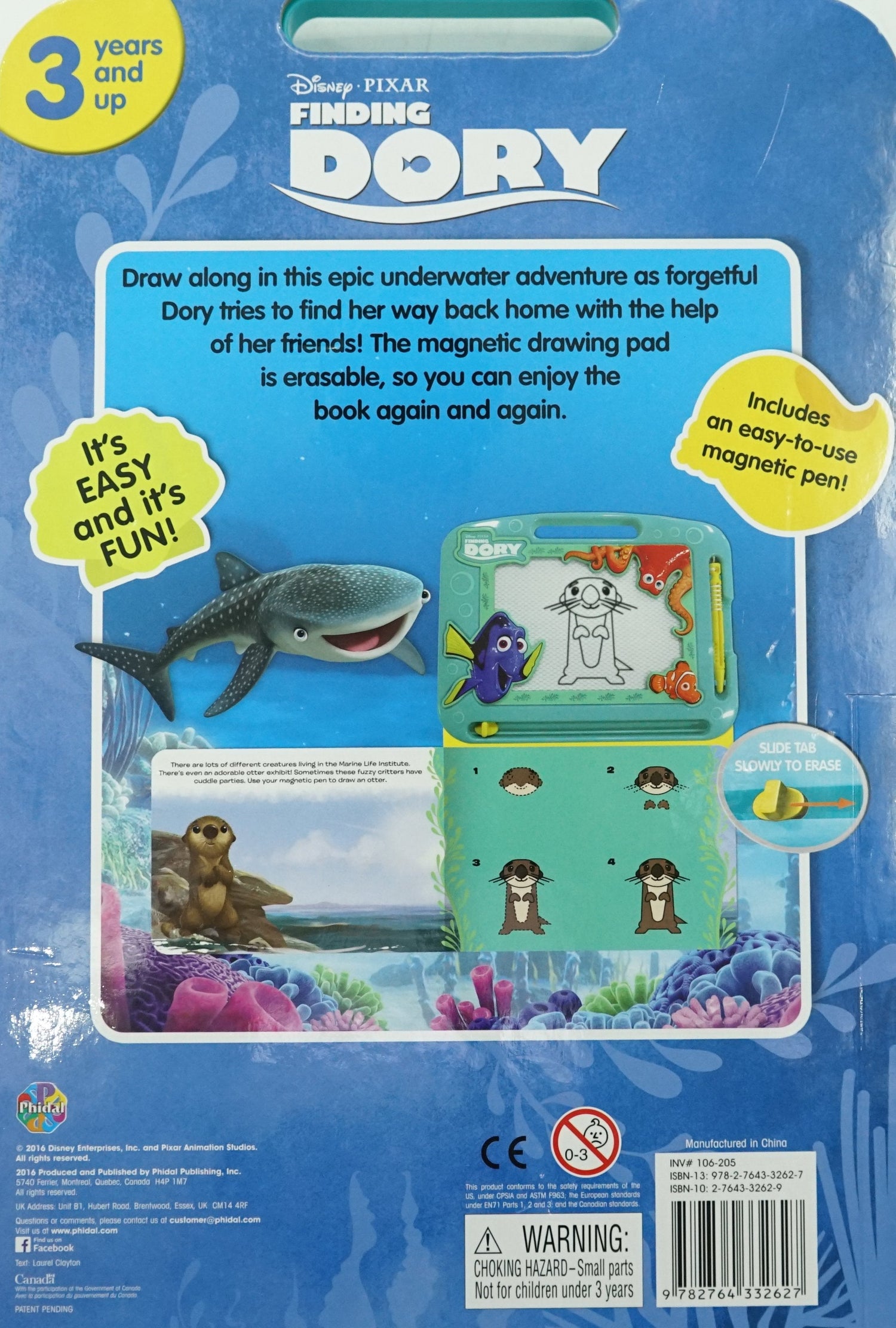 Draw along with friendly but forgetful Dory as she tries to find her way back home in this epic underwater adventure! Designed for children ages 3 and up, this Learning Series book offers a creative drawing experience for your child in the company of familiar faces! It includes a playful story, simple step-by-step drawing instructions, a handy magnetic pen, and a magnetic drawing pad that can be used again and again! Read a page, draw a picture, slide the tab across the bottom to erase it, and then start all over again! Portable and reusable, this activity kit is sure to please. Children will not only have a great time learning how to draw Dory's pals and images from her ocean world, but they can also use the pad to bring their own ideas to life!