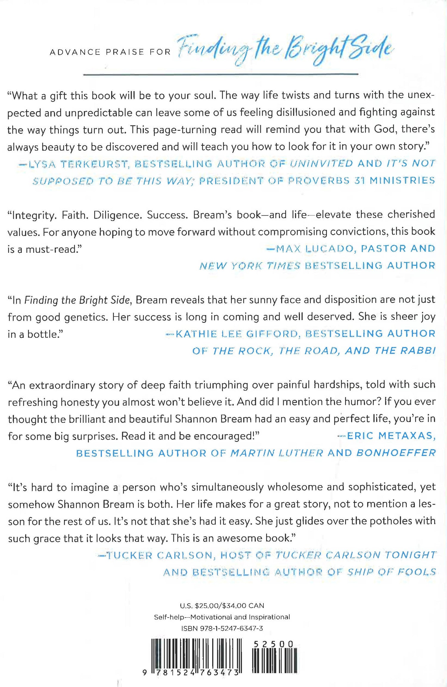 In Finding the Bright Side, Shannon continues a conversation about authenticity, humility, and trusting in God that she's already begun with her followers on social media. She shares behind-the-scenes stories from Washington, D.C., revelations from her time reporting on the Supreme Court, and lessons learned from the most challenging moments of her life—from the time she was fired from her first job and told, “You’re the worst person I’ve ever seen on TV,” to the time she heard “There is no cure.” But through all of this, faith (and a little bit of stubbornness!) has helped Shannon to keep hope, find purpose in the pain, and find laughs along the way.