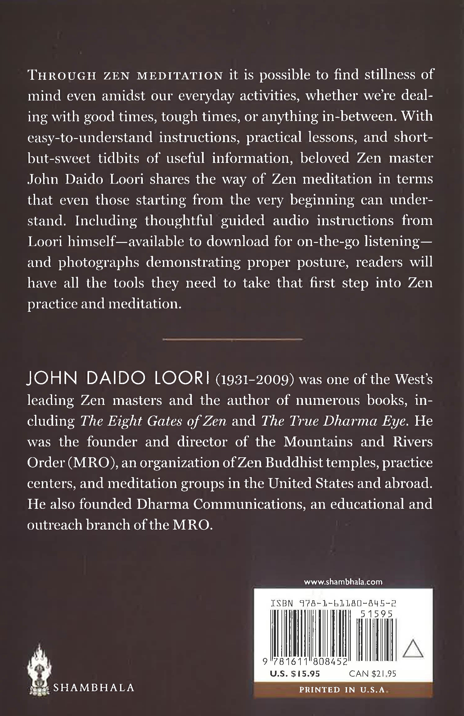 Through Zen meditation it is possible to find stillness of mind even amidst our everyday activities--and this book reveals how. With easy-to-understand instructions, practical lessons, and short-but-sweet tid-bits of useful information, beloved Zen master John Daido Loori shares the way of Zen meditation in terms that even those starting from the very beginning can understand. Guided audio instructions--available for download online--supplement the teachings throughout the book, giving beginners the tools they need to take that first step into Zen practice and meditation.