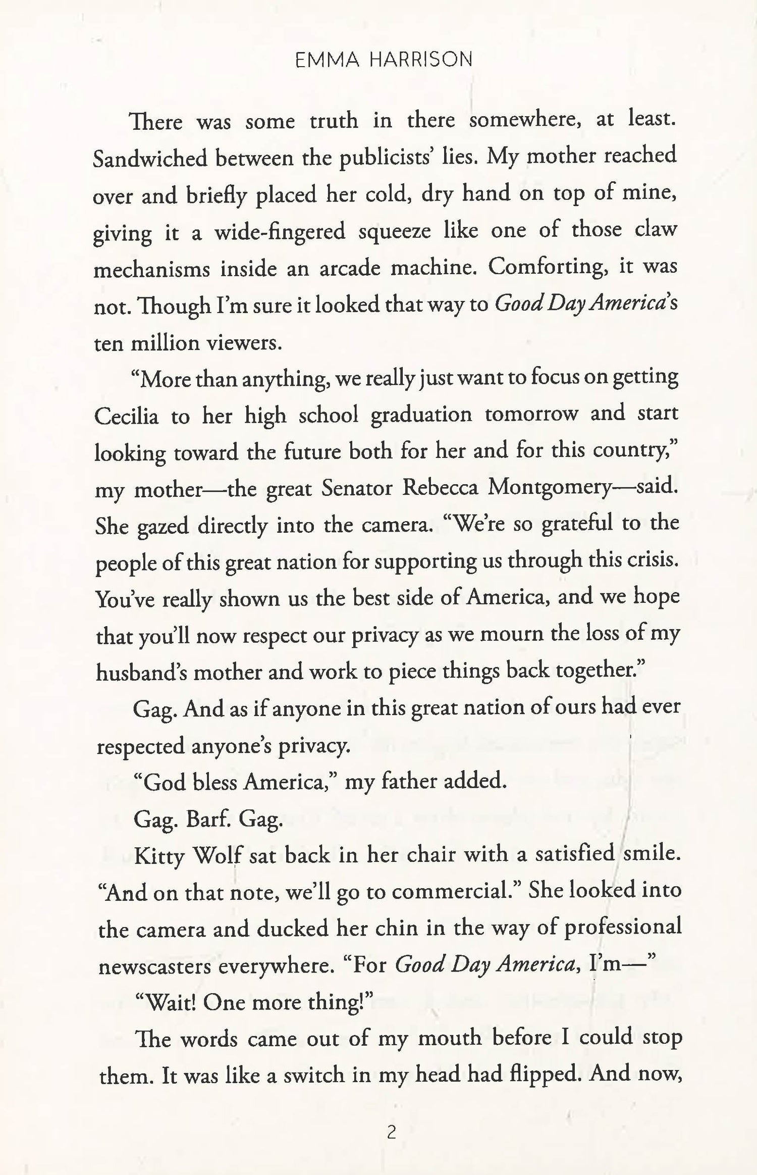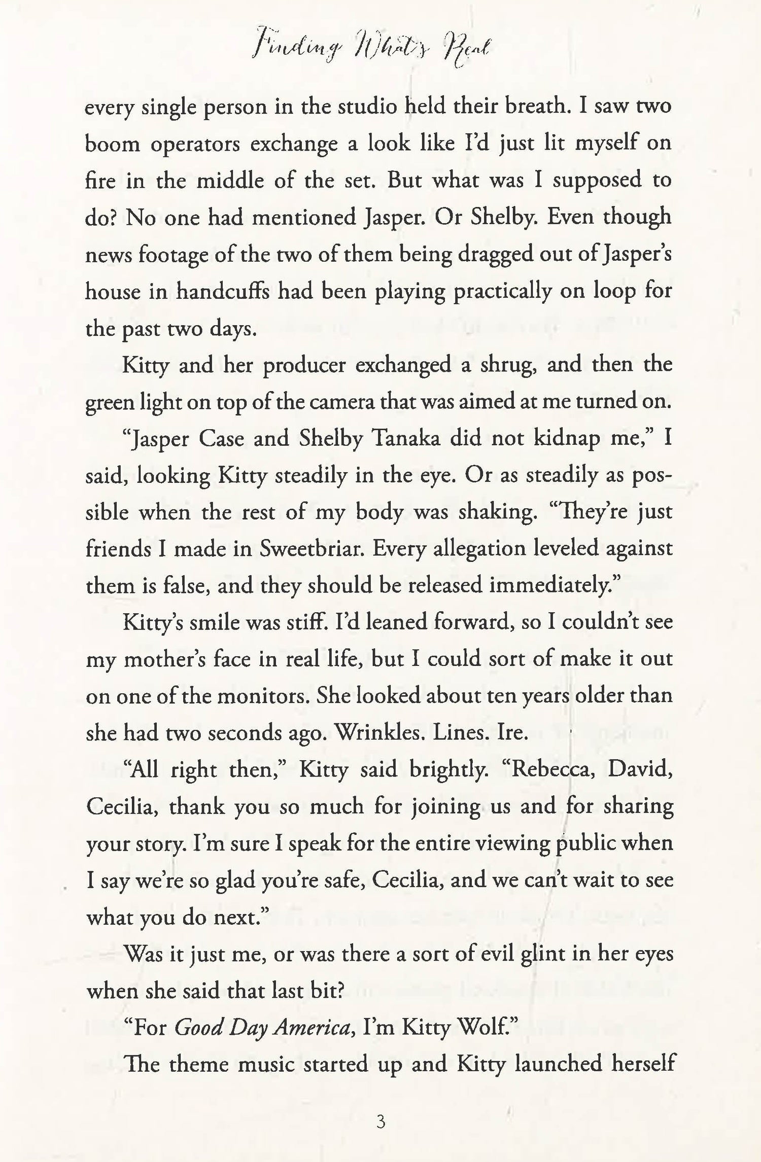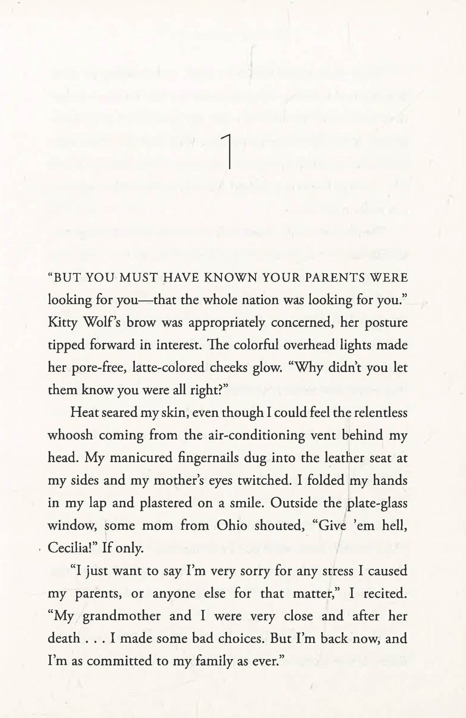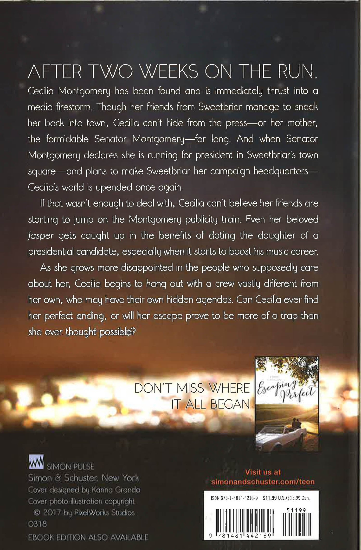 Cecelia Montgomery returns after running away to deal with the downside of her newfound fame - and her mother’s Presidential campaign - in the sequel to Escaping Perfect.Two weeks after going on the run - and running away from a life that was carefully constructed for the past ten years - Cecelia Montgomery finds herself back in the middle of a media firestorm. Before she can blink, Cecilia is forced once again into a public persona she had no part in creating.But her friends from Sweet Briar still have her back. After creating another clever diversion, Fiona, Britta, and Jasper help smuggle her back to Sweet Briar. Just when Cecilia thinks she actually is in the clear, her mother - the formidable Senator Montgomery - drops into town and officially announces she plans to run as the next Presidential candidate, making Sweet Briar campaign headquarters.As Cecelia grows more disappointed in the people who supposedly care about her, she gets pulled deeper and deeper into a group and party scene that is vastly different than her own. Can Cecelia ever find her perfect ending, or will her escape prove to be more of a trap than she ever thought possible?