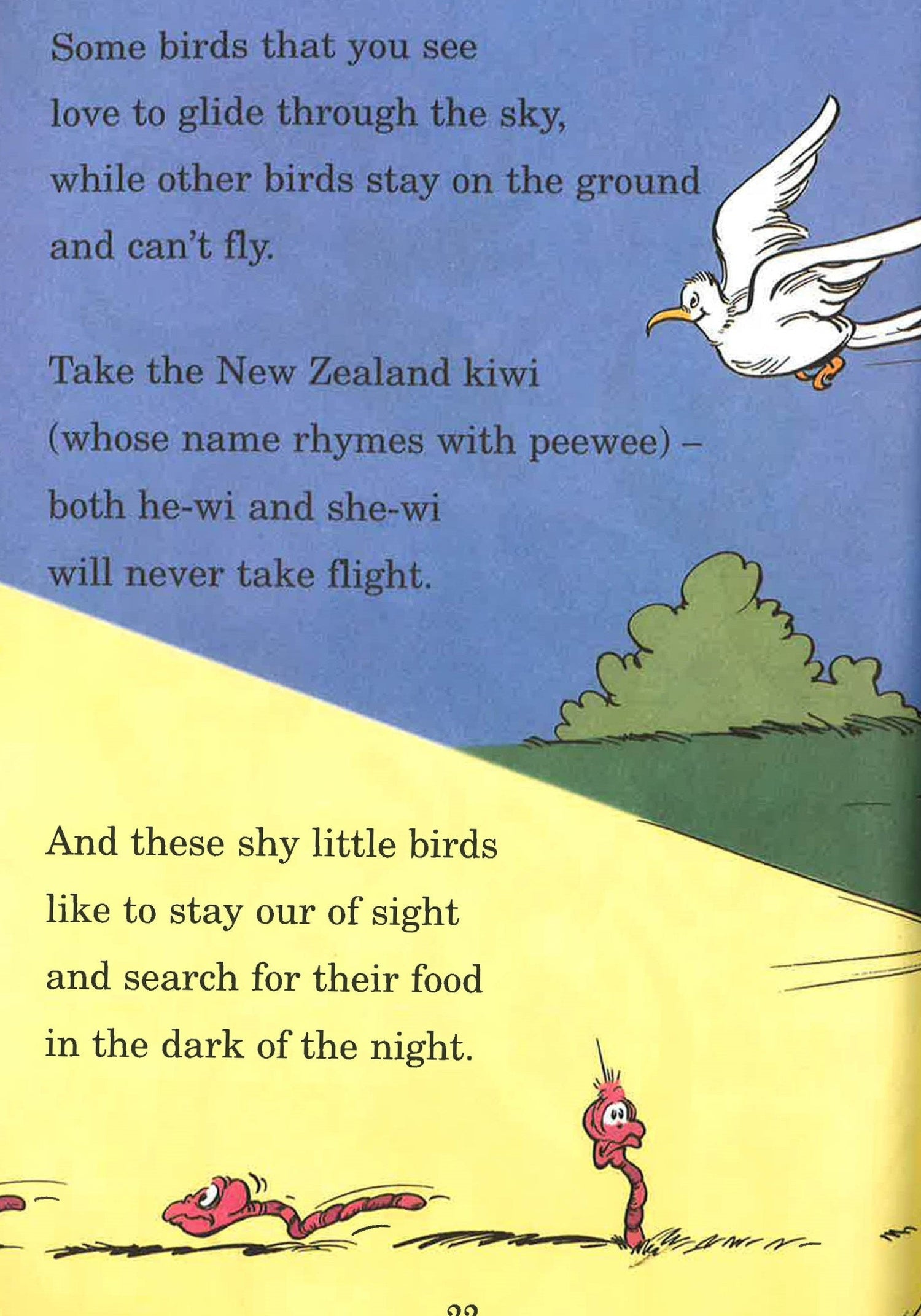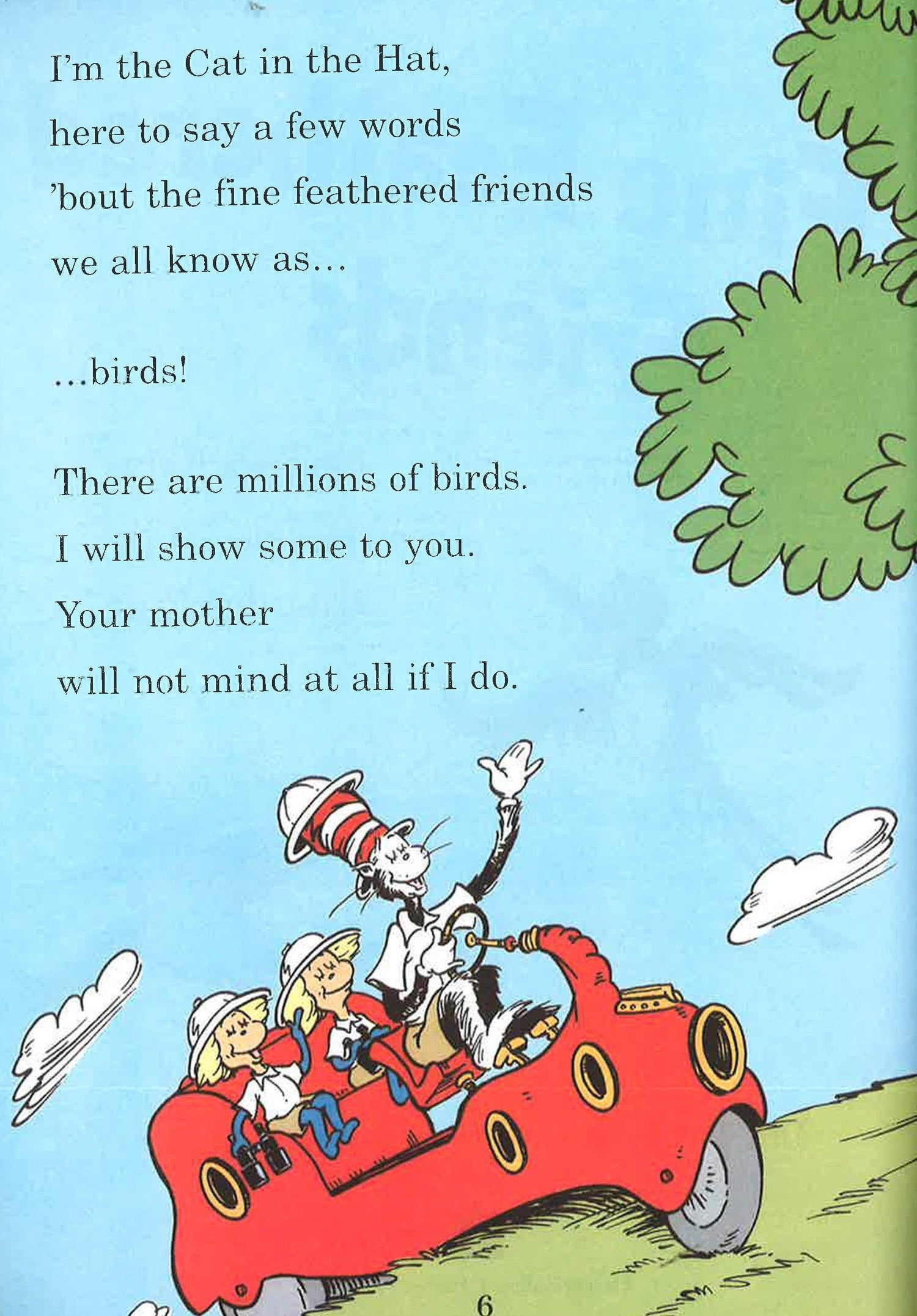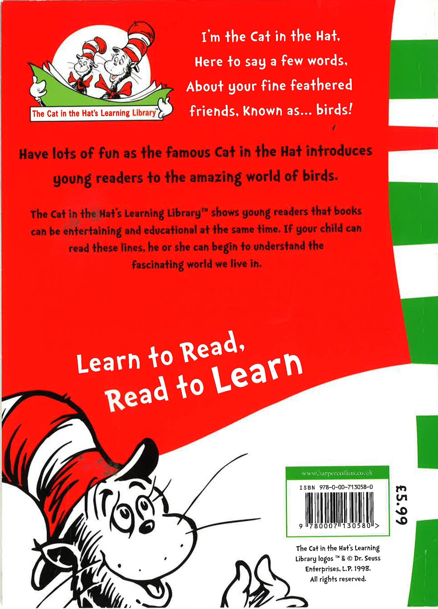 A bird gets its name from the simplest things - what it does, how it looks, or the song that it sings. And so Dr. Seuss' famous Cat in the Hat introduces young readers to the amazing world of birds. This title and others form part of a series of books that takes an off-beat look at nature and natural sciences through a fun combination of Seussian rhymes and zany illustrations. Aimed at early readers - from four to seven year olds - the books are designed to bridge the gap between concept books written for preschoolers and more formal non fiction titles that require fluent reading skills. By presenting the facts in a lively and rhythmic manner, they provide the critical foundation upon which complex facts and ideas can eventually be built..