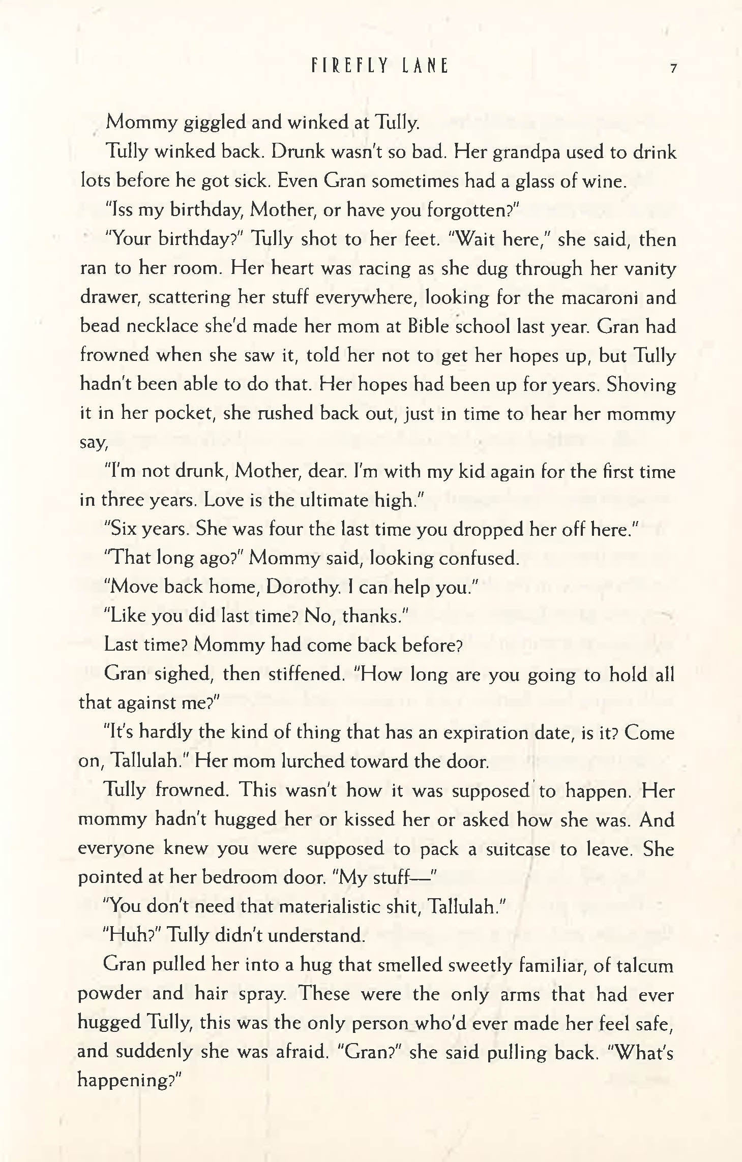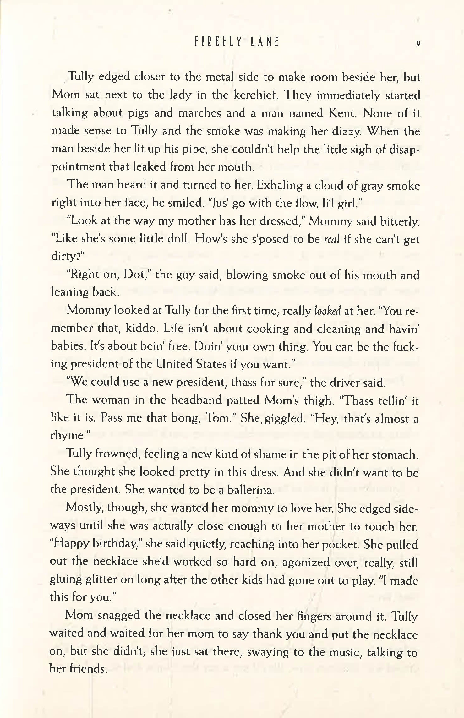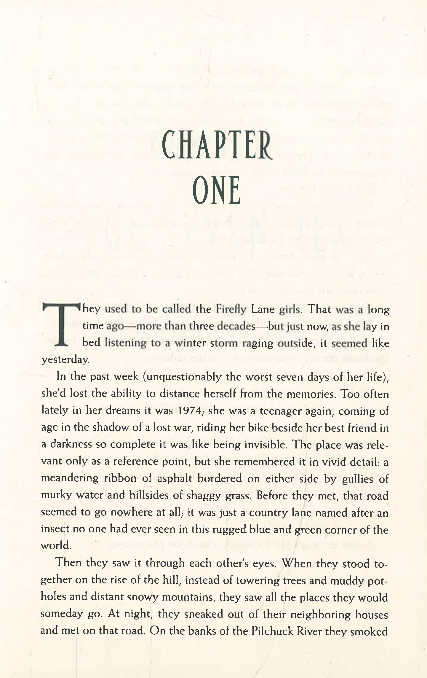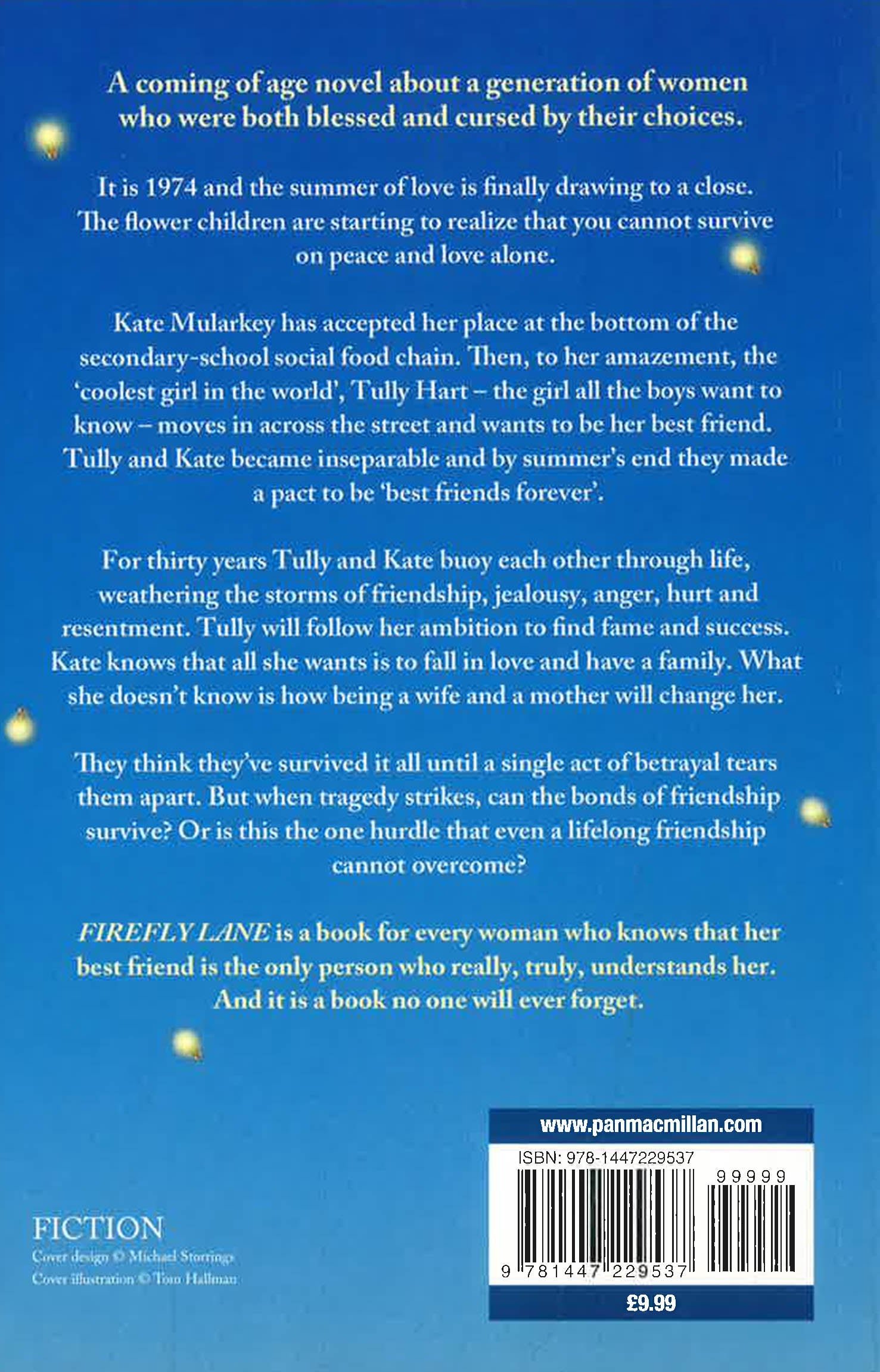 A coming of age novel about a generation of women who were both blessed and cursed by their choices. It is 1974 and the summer of love is finally drawing to a close. The flower children are starting to realise that you cannot survive on peace and love alone. Kate Mularkey has accepted her place at the bottom of the secondary school social food chain. Then, to her amazement, the 'coolest girl in the world', Tully Hart -- the girl all the boys want to know - moves in across the street and wants to be her best friend. Tully and Kate became inseparable and by summer's end they made a pact to be 'best friends forever'. For thirty years Tully and Kate buoy each other through life, weathering the storms of friendship, jealousy, anger, hurt and resentment. Tully will follow her ambition to find fame and success. Kate knows that all she wants is to fall in love and have a family. What she doesn't know is how being a wife and a mother will change her. They think they've survived it all until a single act of betrayal tears them apart. But when tragedy strikes, can the bonds of friendship survive? Or is it the one hurdle than even a lifelong friendship cannot overcome. FIREFLY LANE is a book for every woman who knows that her best friend is the only person who really, truly, knows her. And it is a book she will never forget.