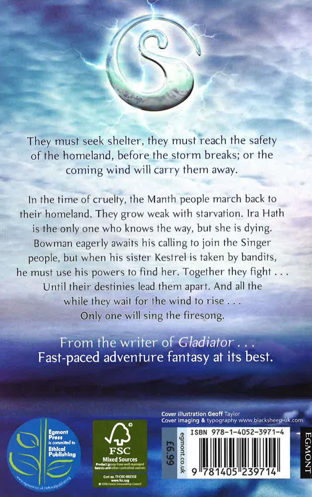In the time of cruelty, the Manth people march back to their homeland. Ira Hath is the only one who knows the way, but she is dying. Bowman eagerly awaits his calling to join the Singer people, but when Kestrel is taken by bandits, he must use his powers to find her. Together they fight, until their destinies tear them apart. And all the while they wait for the wind to rise. Only one will sing the firesong... Fantasy books for children don't get more spectacular than Firesong. Since first publication, William Nicholson's Wind on Fire trilogy has been translated into over 25 languages and won prizes including the Blue Peter Book Award and Smarties Prize Gold Award.