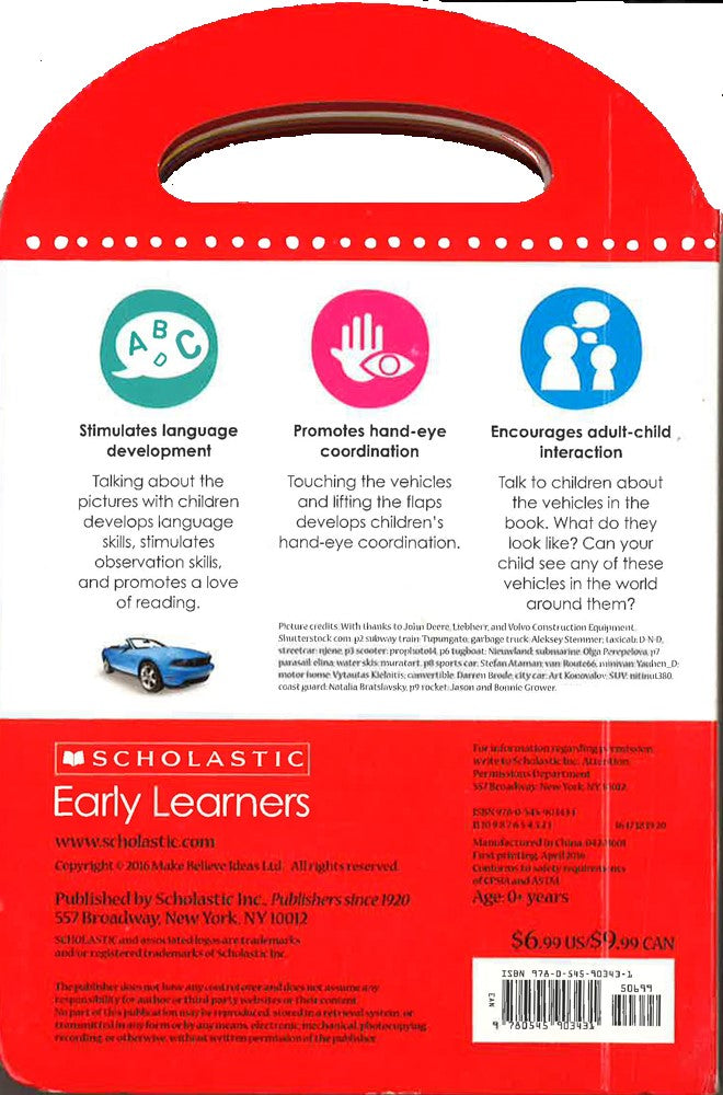 In Things That Go, learn 100 new words associated with trucks, trains, and all things transportation! Packed with sturdy flaps to lift and tactile areas to touch, this is the perfect bookfor curious little ones to explore! The carry-me handle is fun for little ones to hold and allows them to take their book with them wherever they go. A fantastic Interactive series with touch and feels and flaps to encourage children to learn their first words!Scholastic Early Learners: Interactive books for hands-on learning. Perfect for babies, toddlers, preschoolers, kindergarteners, and first graders, too!