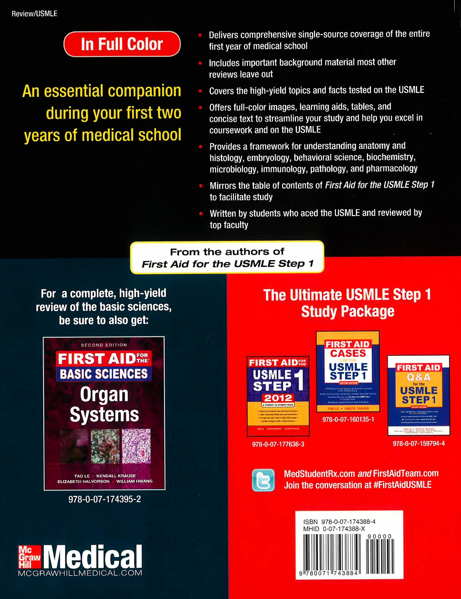The essential companion for your first two years of medical school First Aid for the Basic Sciences: General Principles, 2e provides you with a solid understanding of the basic science principles with which all medical students must be familiar. The second edition has been completely revised to feature a more student-friendly and approachable text, an updated high-yield rapid review section, new images, and more. Delivers comprehensive single-source coverage of the entire first year of medical school Includes important background material most other reviews leave outCovers the high-yield topics and facts tested on the USMLEOffers full-color images, learning aids, tables, and concise text to streamline your study and help you excel in coursework and on the USMLEProvides a framework for understanding anatomy and histology, embryology, behavioral science, biochemistry, microbiology, immunology, pathology, and pharmacologyMirrors the table of content of First Aid for the USMLE Step 1 to facilitate studyWritten by students who aced the USMLE and reviewed by top faculty