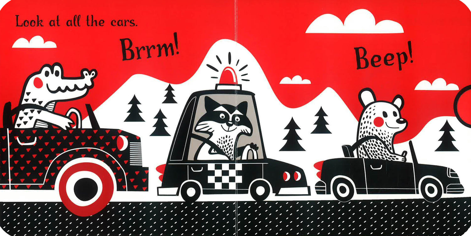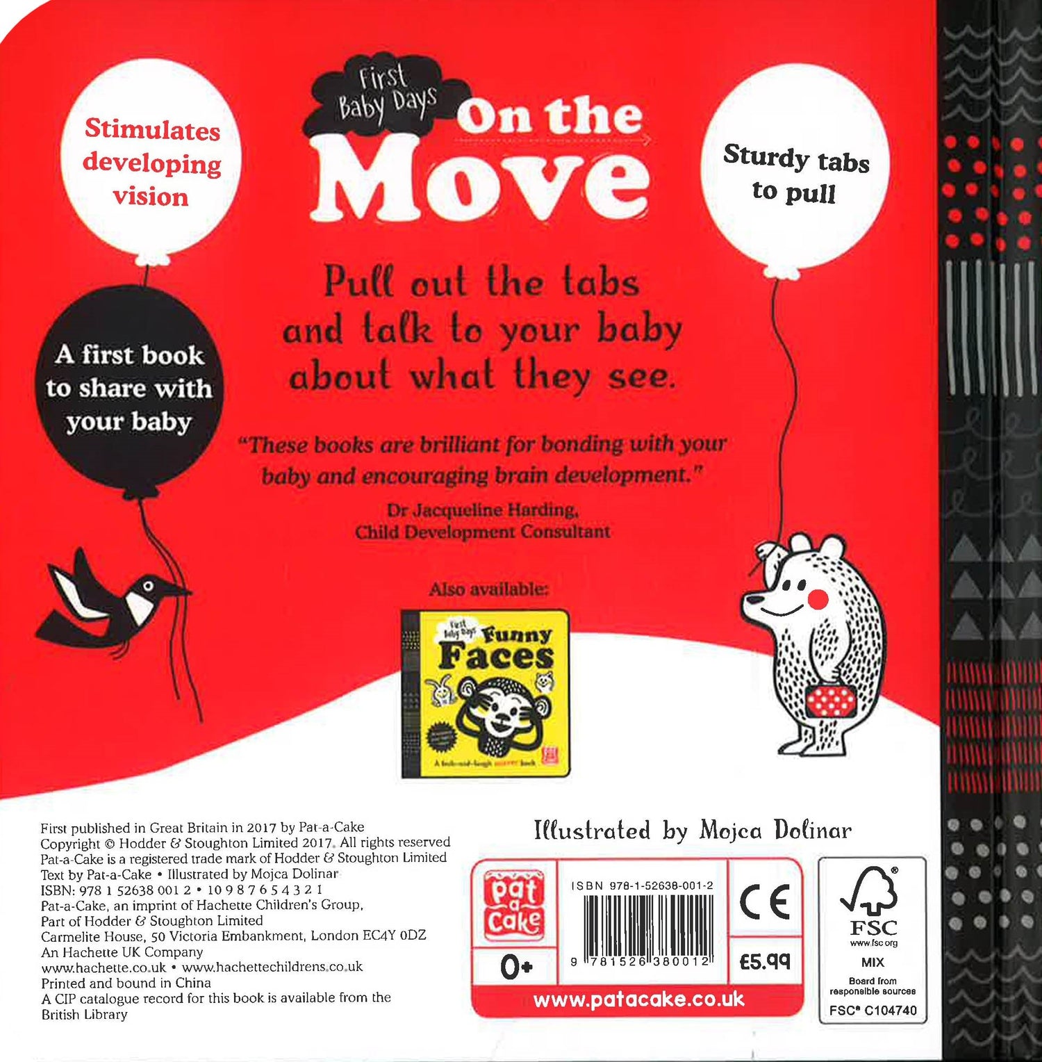 Babies will love this bright and bold high-contrast book, perfect for sharing from birth!High-contrast colours are easy for very little babies to focus on, and along with the fun double tabs to pull, On the Move will engage and entertain babies as their eyesight and senses develop. The friendly animal characters will guide you through the book, and there are lots of extra sounds to make (beep, beep!) and fun things to spot.On the Move aids the development of babies' eyesight by using high-contrast colours and patterns, striking illustrations and pages that pull out in different directions. Babies will react with delight as they track and scan the pictures and patterns that are revealed as you pull the tabs, while the simple text prompts parent interaction.Also available: Funny Faces, Moo Peek-a-Boo, Bath Time, Animal Train, Splish, Splash