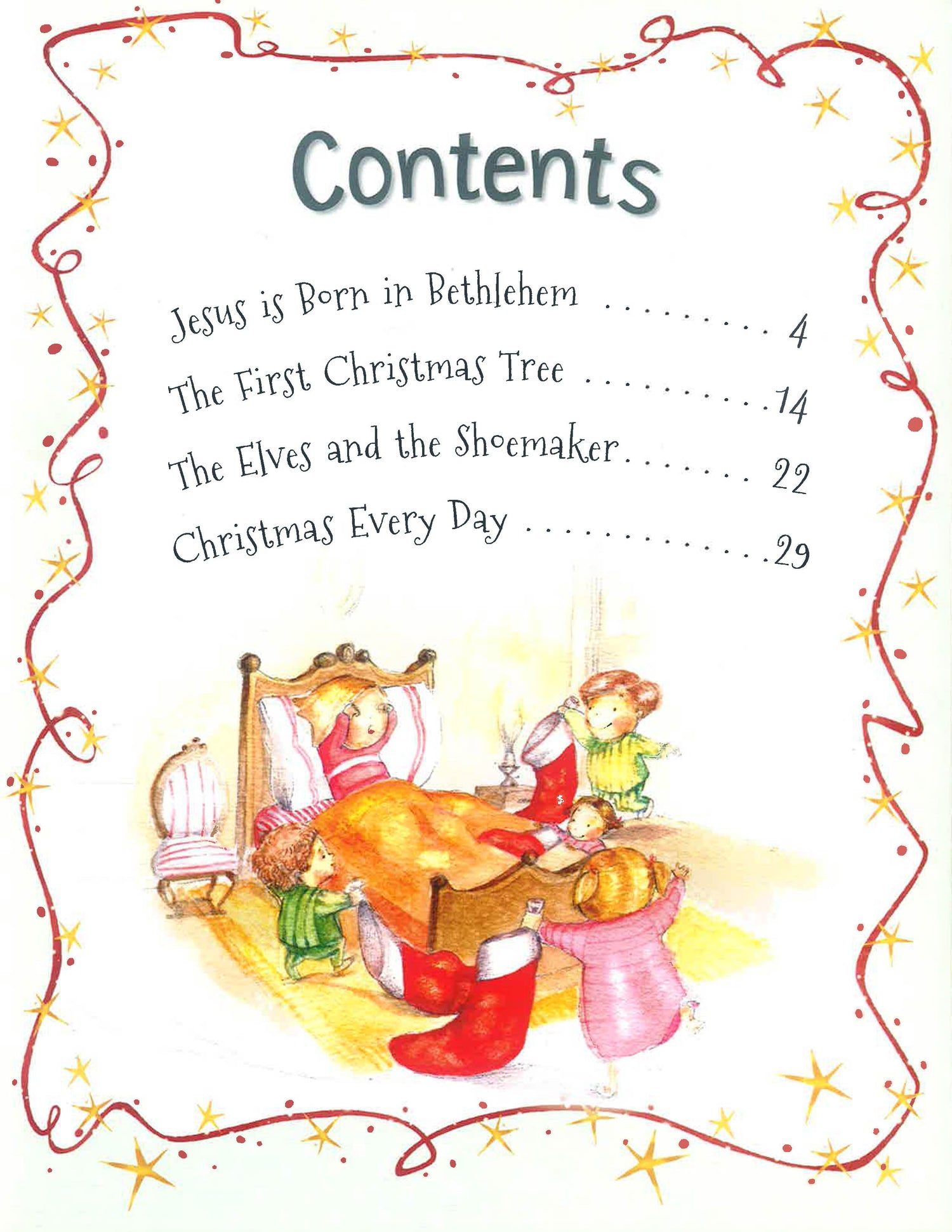 Christmas Stories The First Christmas Tree and other stories is a wonderfully festive storybook for children aged 5+. Beautifully illustrated throughout, every story is brimming with magic, fun, presents and goodwill. With a stunning sparkly cover, this book is an ideal gift at Christmas time. Stories included: Jesus is Born in Bethlehem, The First Christmas Tree, The Elves and the Shoemaker, Christmas Every Day.