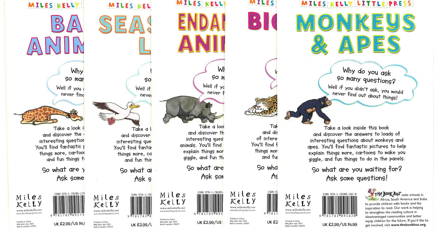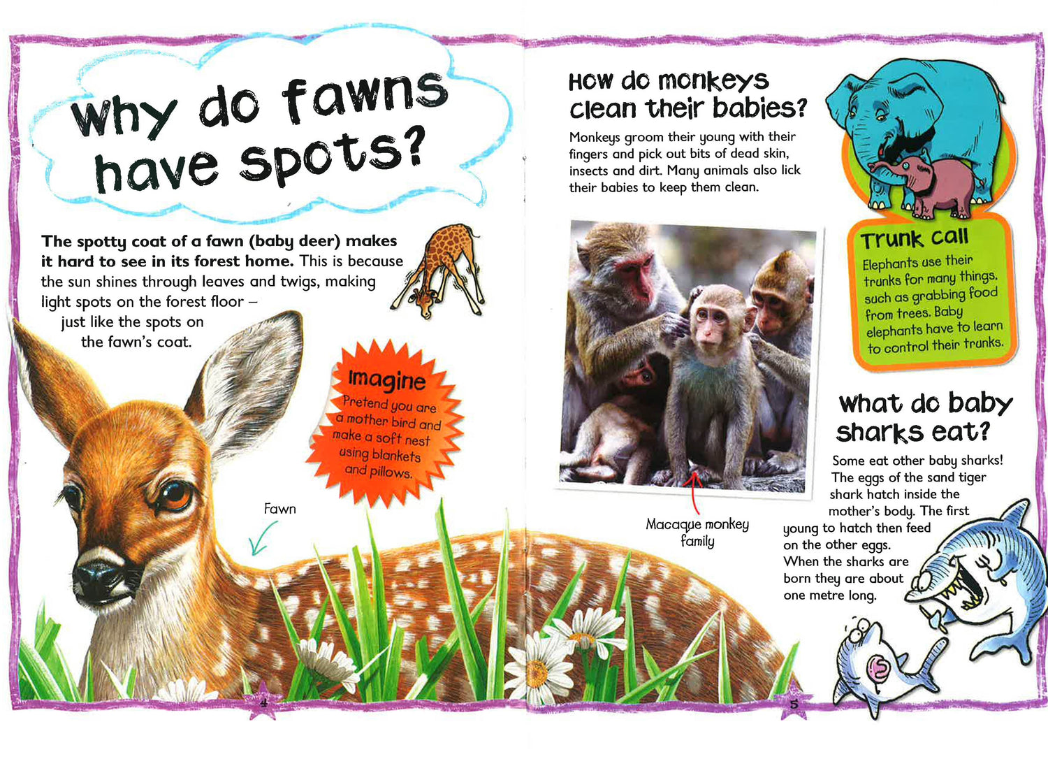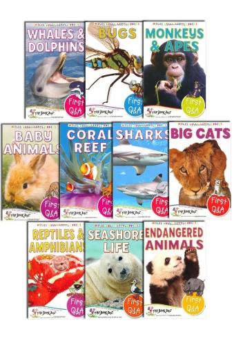 These books are full of big questions about the animal world! Children can find out everything from why kangaroos have pouches to how polar bear cubs keep warm, to why whales are so big and why dolphins squeak. More than 30 fun questions, clear answers and fantastic illustrations to help explain things further. They also include cartoons and extra-special facts to keep kids entertained. Titles in this pack include: Baby Animals Which animal is the best mum Why do kangaroos have pouches Why do lion cubs play fight What do baby pandas eat Big Cats What is the bounciest cat How do snow leopards keep warm Which cat goes fishing How do cats see in the dark Bugs Why are butterflies brightly coloured Why do bees make honey Why do ladybirds have spots Do earwigs really live in ears Coral Reef Why are corals different shapes Which crab moves house How do fish clean their teeth Why does an octopus have eight arms Endangered Animals How many animals die out every day Why do polar bears need ice Which ape is the most endangered Are mountain gorillas safe Monkeys & Apes Do apes love their mums Why do chimps kiss Why do gorillas beat their chests Which monkey has a moustache Reptiles & Amphibians Which toad carries eggs on its back Are dragons real Why do lizards stick on walls Why can't iguanas blink Seashore Life Why do birds love the seaside Why are pebbles round Where do turtles lay their eggs What hides in the sand Sharks Do sharks go to sleep Why are sharks so scary Which fish stick to sharks Do sharks lose their teeth Whales & Dolphins Why do whales sing How do dolphins say hello Why do whales puff and blow Why do whales and dolphins get stranded
