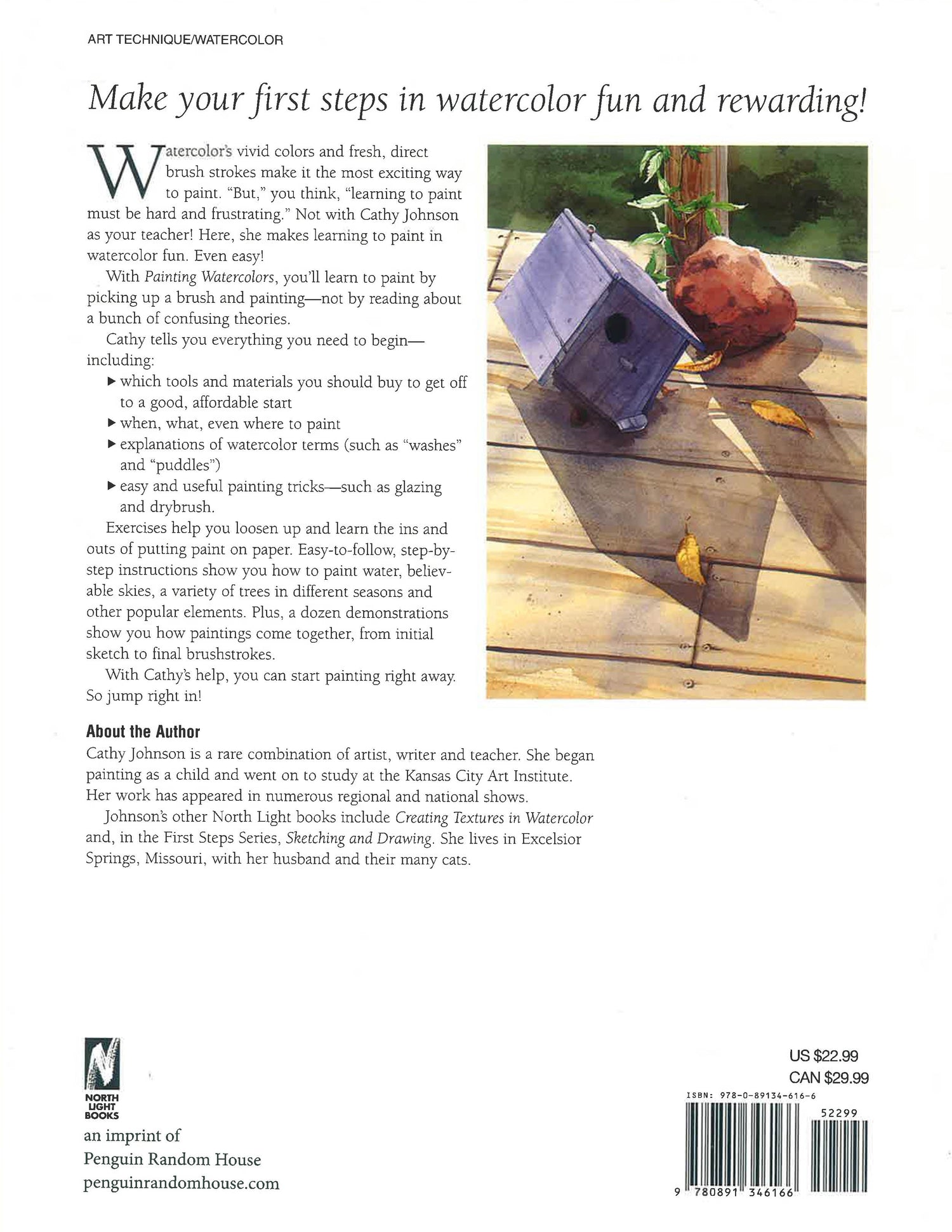 Watercolor's vivid colors and fresh, direct brush strokes make it the most exciting way to paint. "But," you think, "Learning to paint must be hard and frustrating." Not with Cathy Johnson as your teacher! Here, she makes learning to paint in watercolor fun—even easy!