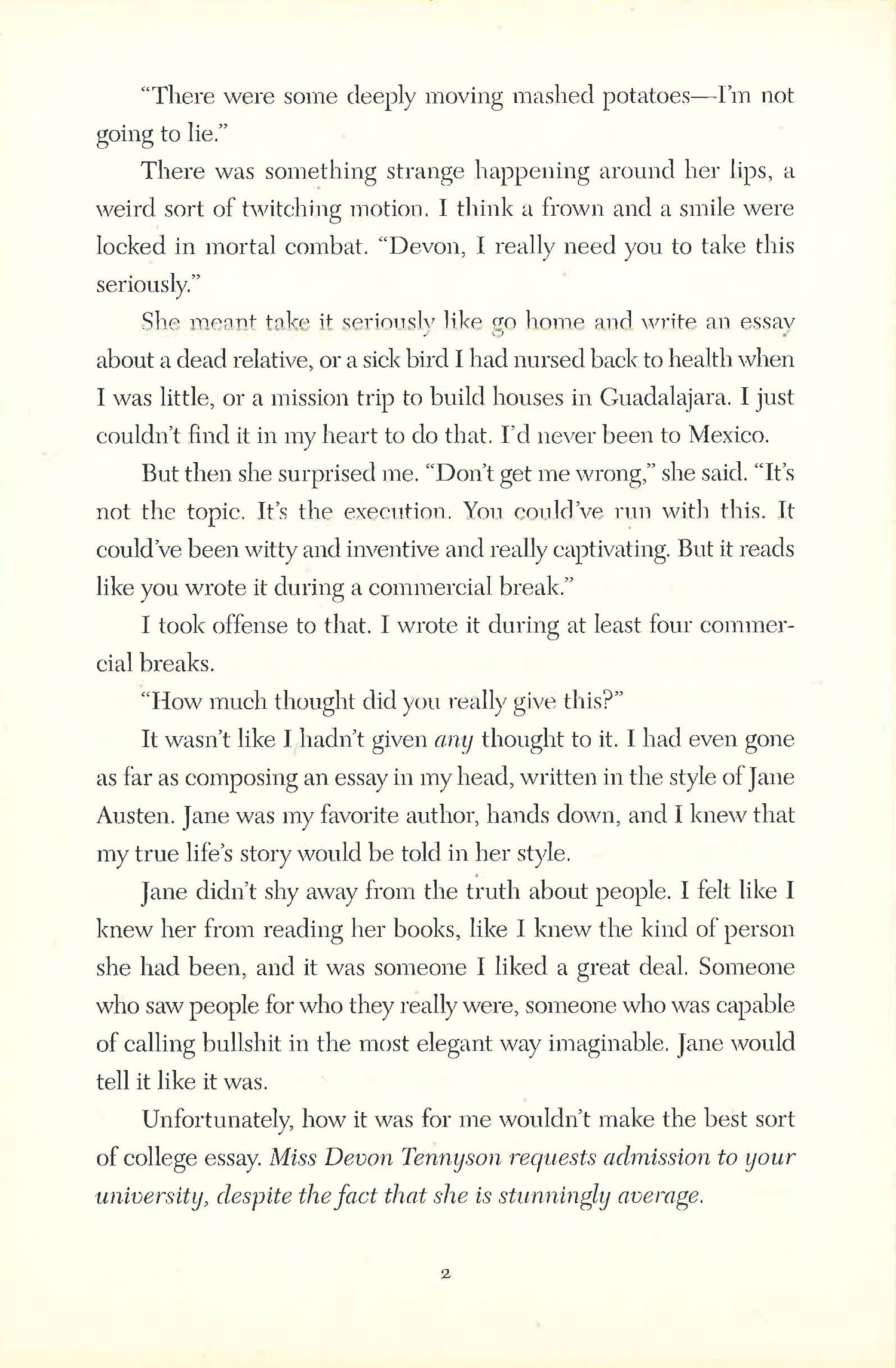 Pride and Prejudice meets Friday Night Lights in this contemporary novel about falling in love with the unexpected boy, with a new brother, and with yourself. Devon Tennyson wouldn't change a thing. She's happy watching Friday night games from the bleachers, silently crushing on best friend Gas, and blissfully ignoring the future after high school. But the universe has other plans. It delivers Devon's cousin Foster, an unrepentant social outlier with a surprising talent for football, and the obnoxiously superior and maddeningly attractive star running back, Ezra, right where she doesn't want them - first into her P. E. class and then into every other aspect of her life. Pride and Prejudice meets Friday Night Lights in this contemporary novel about falling in love with the unexpected boy, with a new brother, and with yourself.