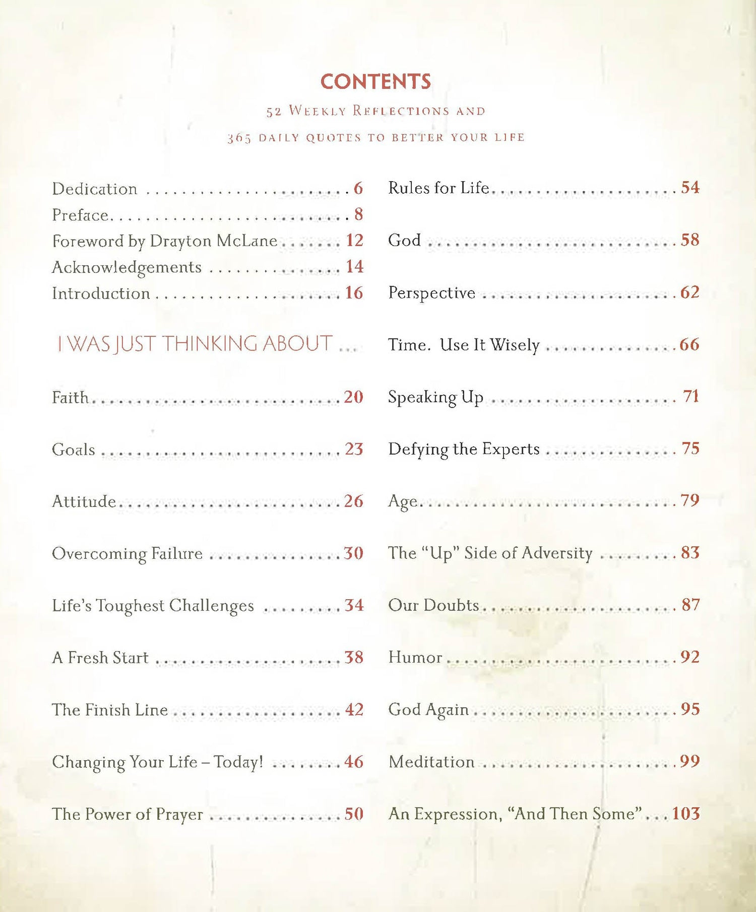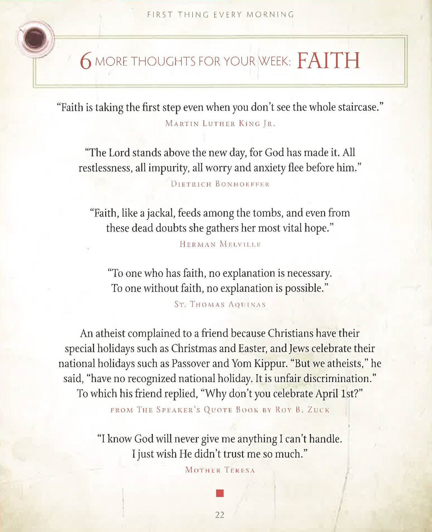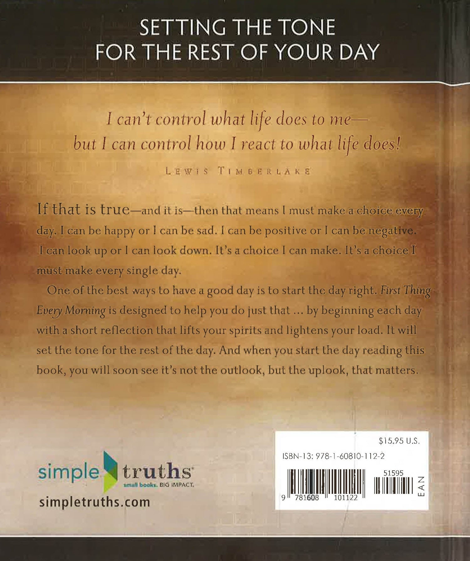 First Thing Every Morning has everything you need to energize your life and make the best use of those 86,400 seconds each day through—reflections, stories and quotes that will lift your spirits and lighten your load. There are 217 reflections in this book. Read one each day to start your day right, or skip ahead for more daily inspiration. Each chapter tells a brief inspirational story and is enhanced with several quotes for the day. Some chapters even include space for you to write down your own thoughts.