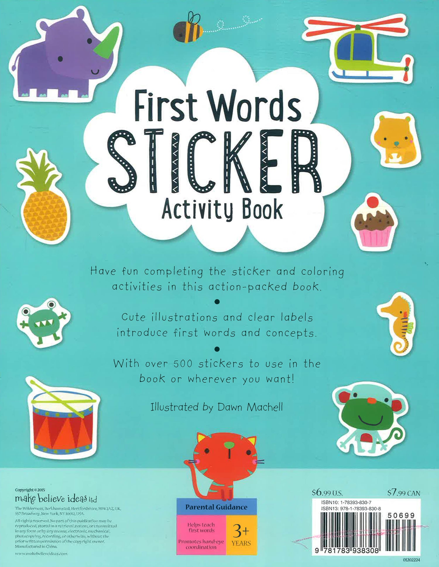 First Words Sticker Activity Book, with over 1000 stickers to use in the book or elsewhere! Introducing a brilliant First Word Sticker Activity Book, packed full of simple, engaging activities designed to introduce children to their first words and concepts. Each page features Dawn Machell s adorable illustrations, along with fun activities designed around the words. The simple instructions and helpful annotations show children what to do for each activity, and there are lots of colorful stickersincluded to keep children happy for hours!